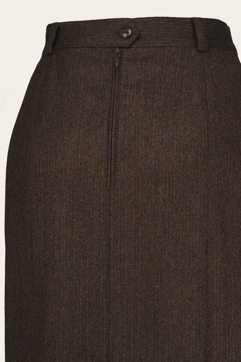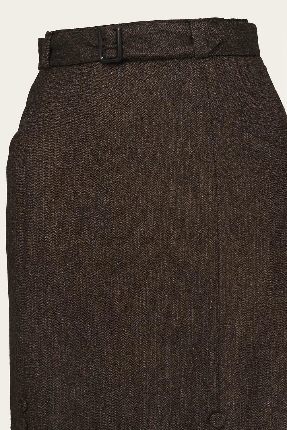 Elegant pencil skirt inspireret af 1930’erne med store lommer, kick pleats og bæltestropper. En klassiker med vintage charme og moderne funktionalitet.
