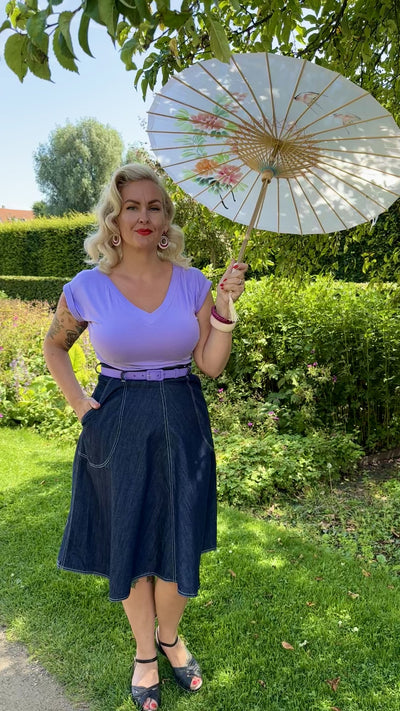 Nederdelen er i kraftig denim, og den lukkes med lynlås i siden. Denne nederdel har bare det helt rigtige vintage rockabilly look.