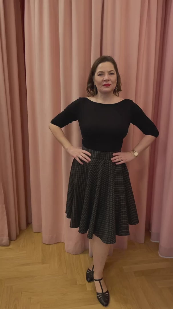 Den skønne boatneck top er i behagelig viskose med let stræk. Den sidder indtil kroppen, så den egner sig perfekt til vintage looket med højtaljede nederdele og bukser.