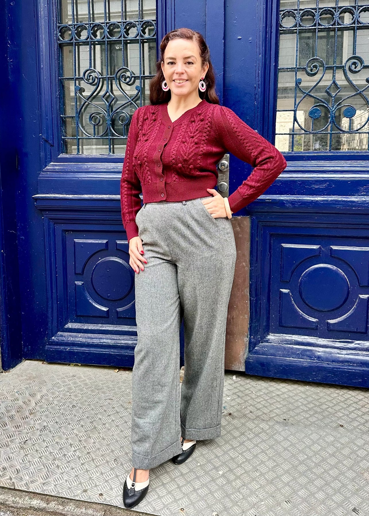 1940'er stils cardigan i 100% merino uld med smukt mønster i burgundy fra Weekend Doll.