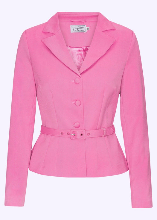 Den skønne cerise pink, gør denne jakke super smuk med en sommerlig swingnederdel under, samt et par høje hæle.