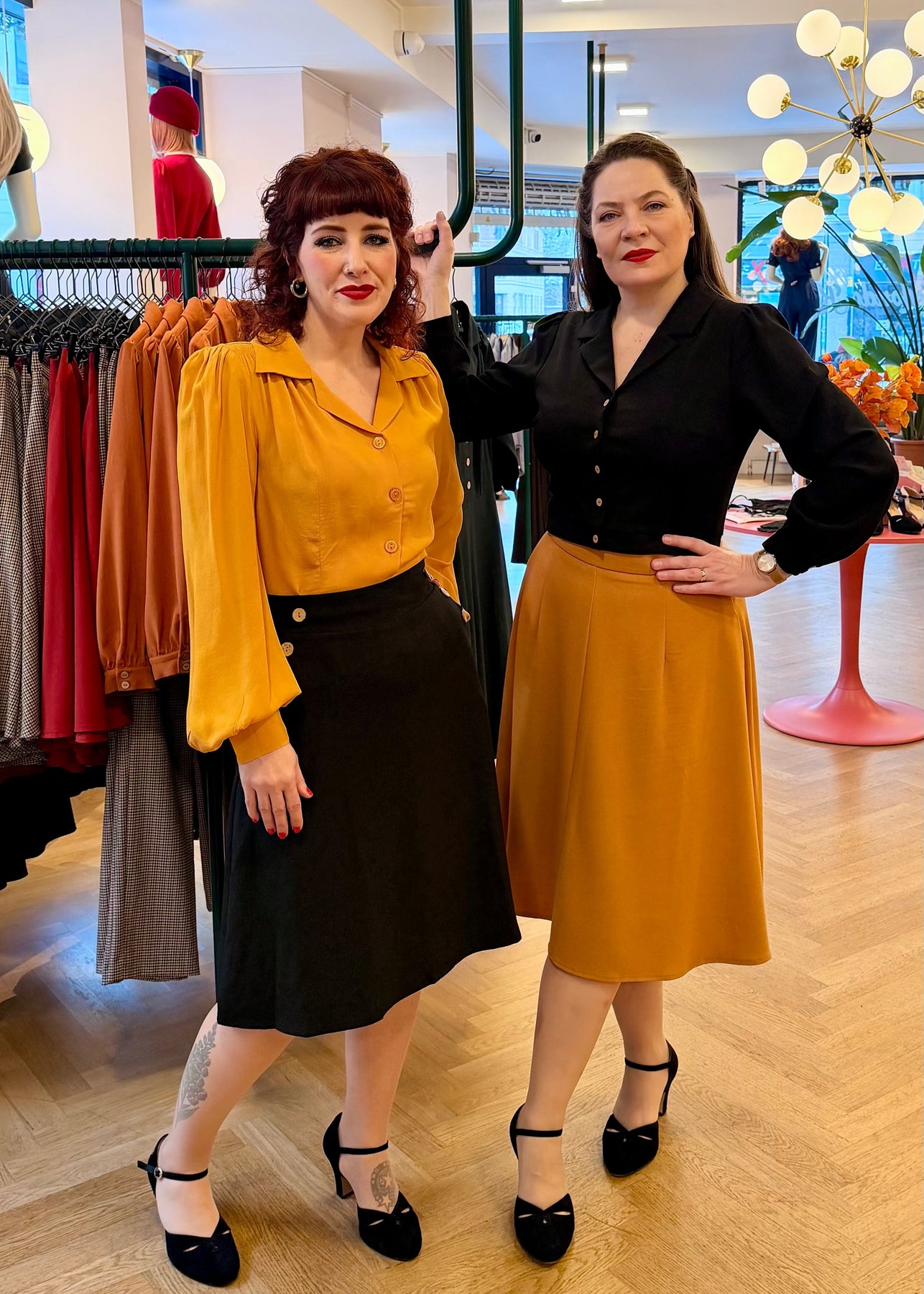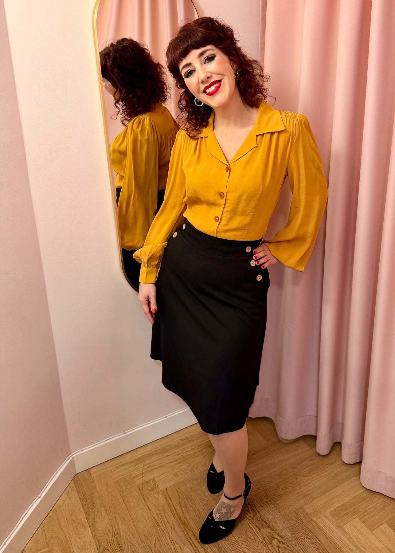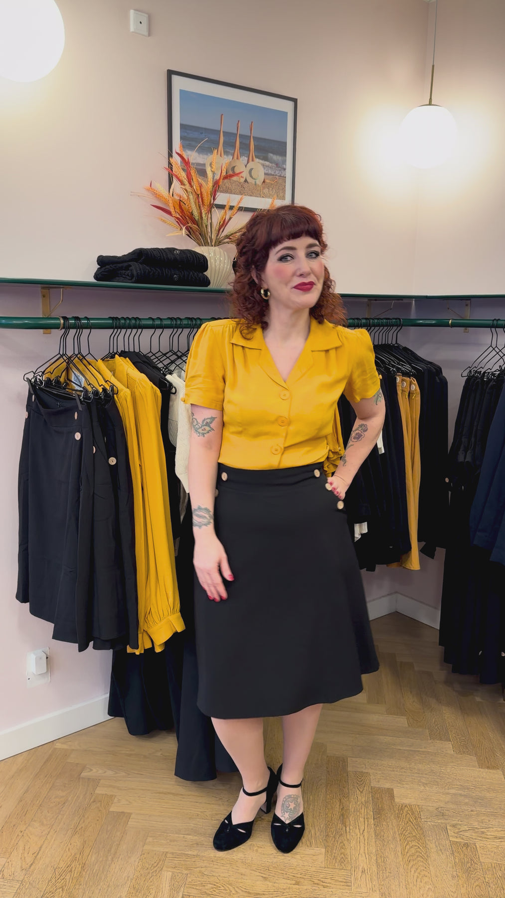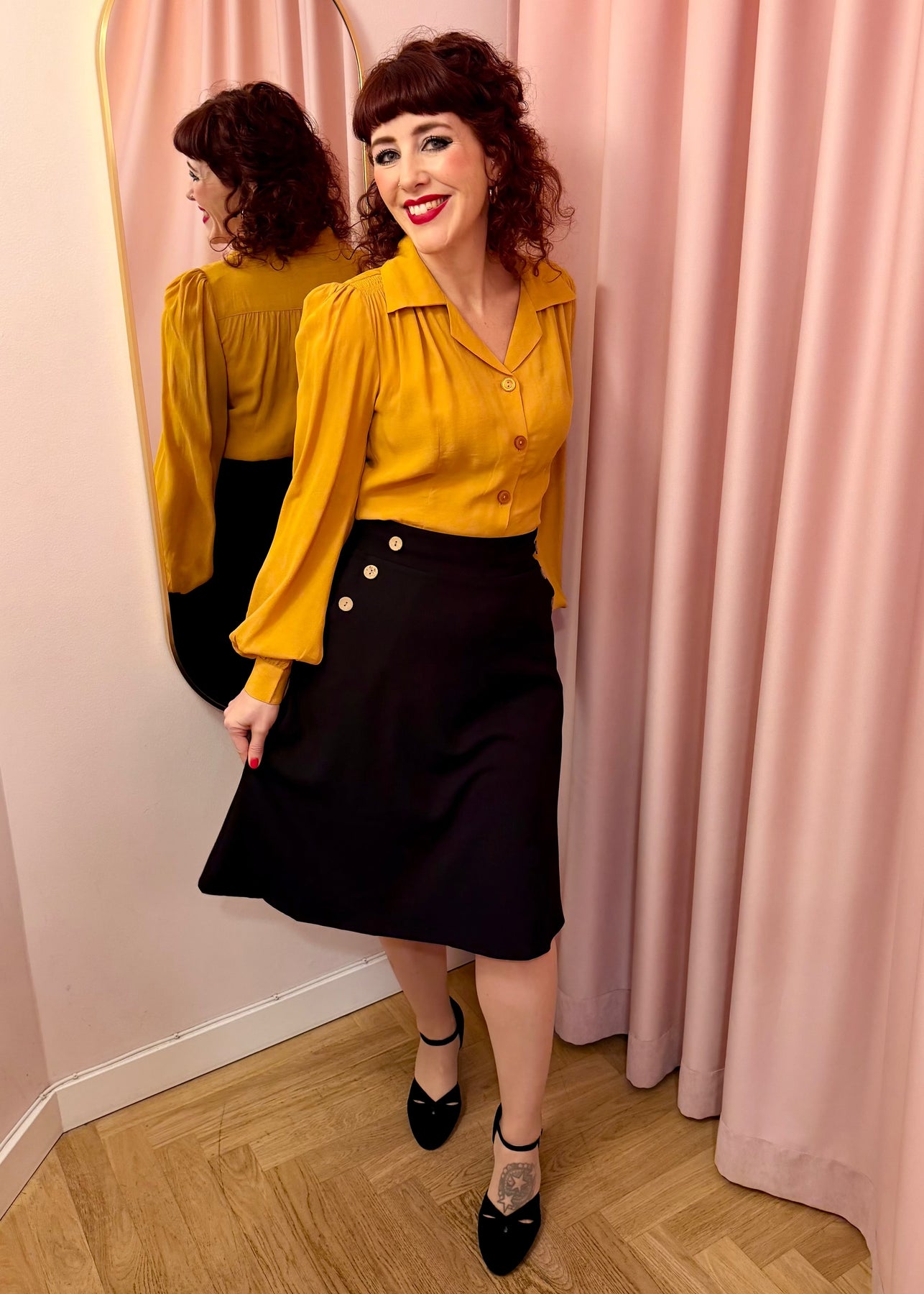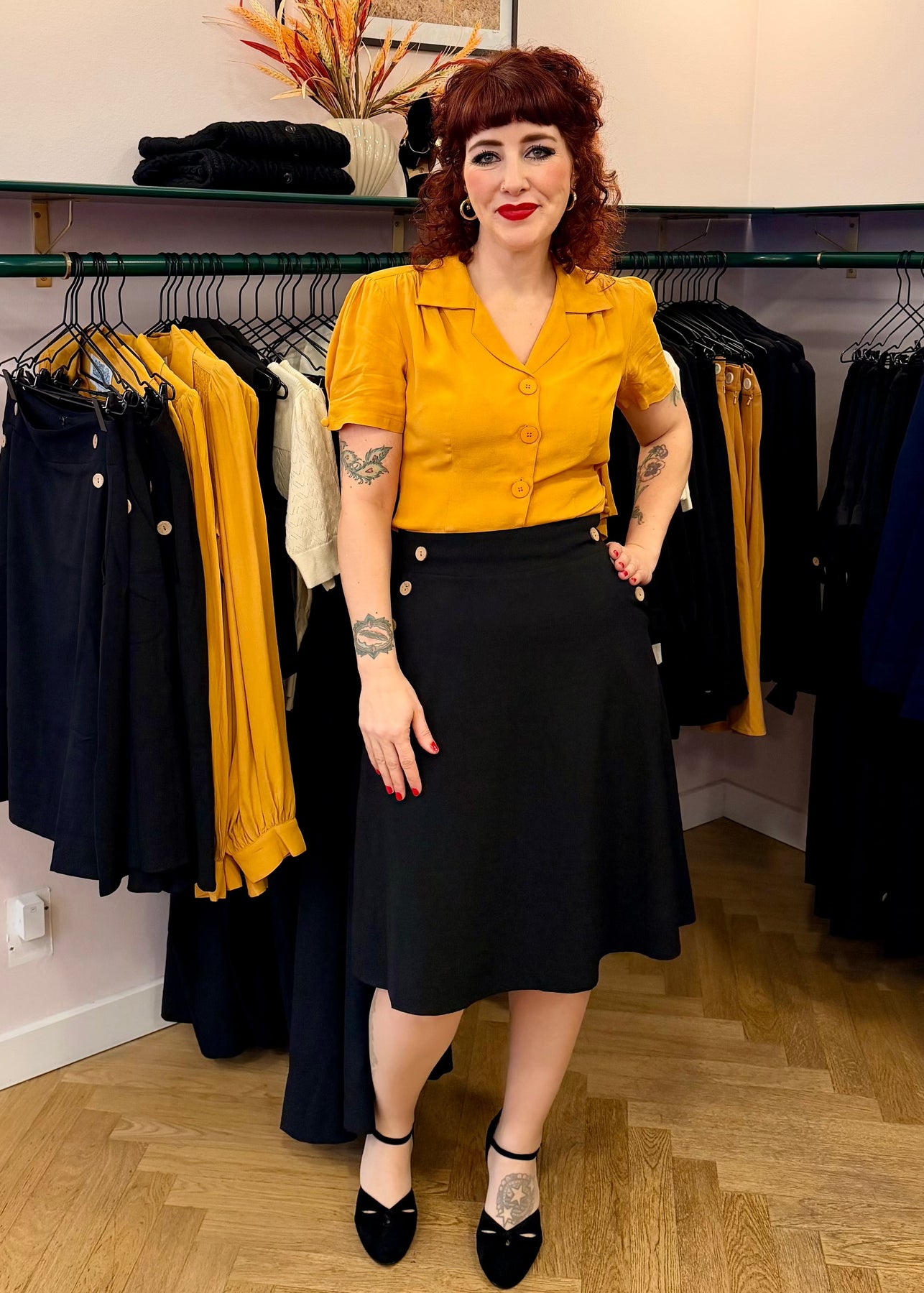 Den sorte farve og linen-look vævning gør nederdelen utrolig alsidig. Brug den til en feminin skjortebluse, en farverig retro top eller en enkel T-shirt for et mere afslappet hverdagslook. Til et fuldt vintage outfit kan du matche nederdelen med en af Daisy Dappers smukke toppe.
