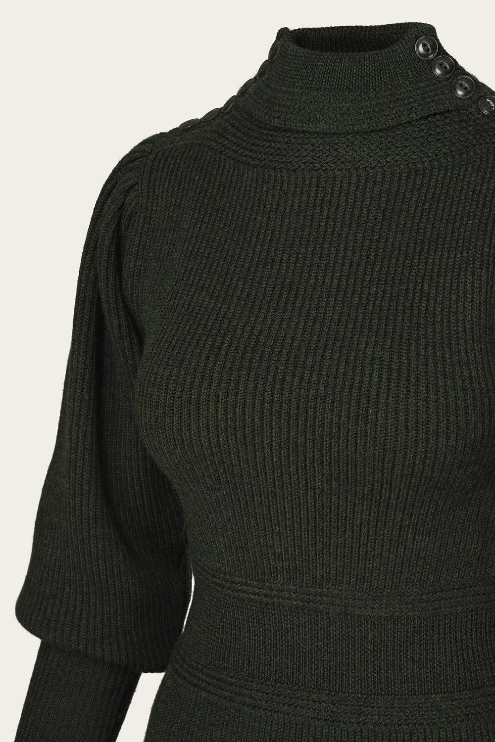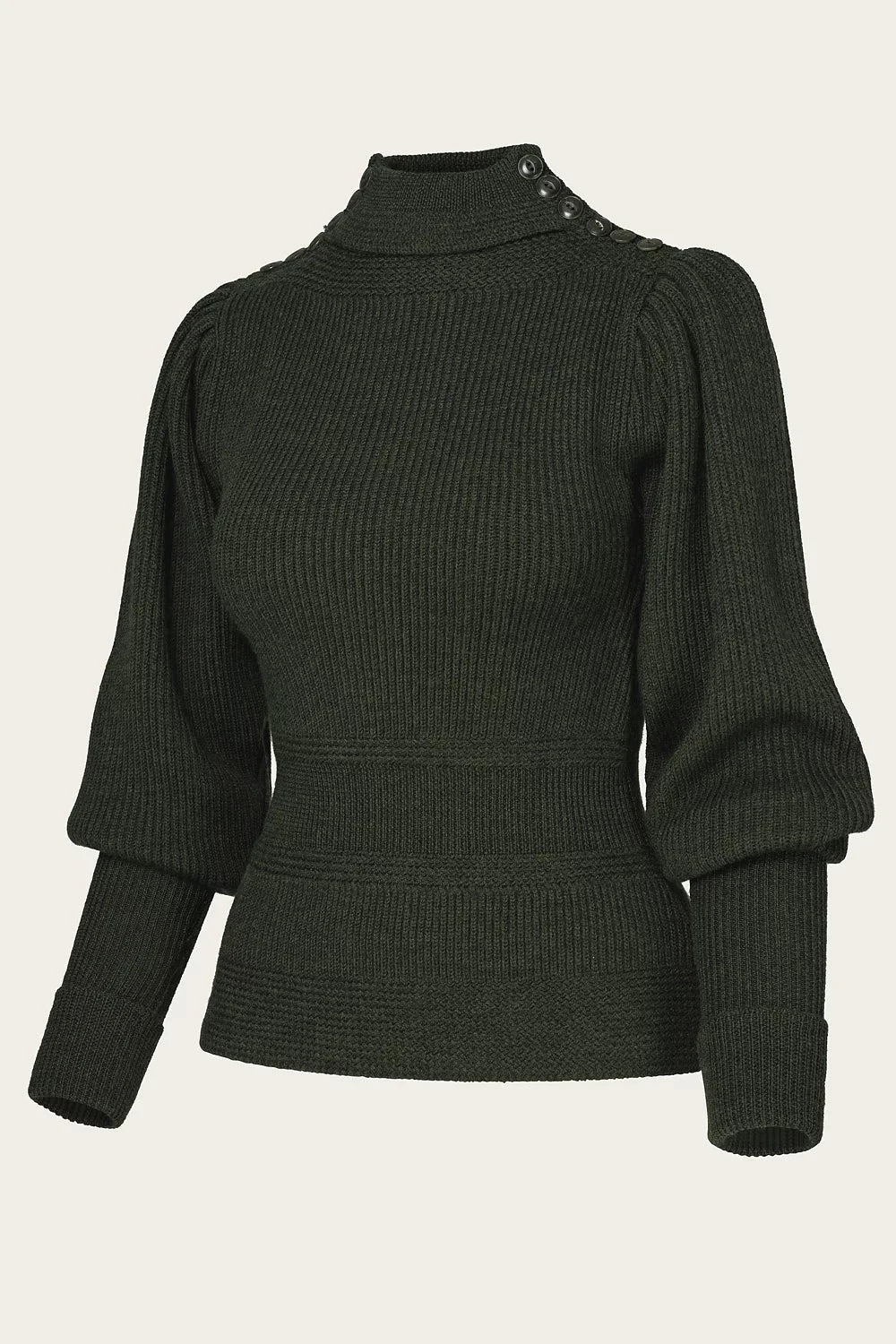 Emmys Edwardian Cycling Sweater er baseret på det originale 1890'er design, hvor dette look opstod. Sweateren har en høj hals, med et flot ombuk, og knapper på begge skuldre.