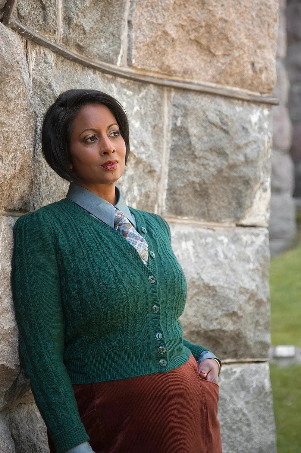 The Ice Skater cardigan er en favorit som ingen bør være foruden. Flatterende kabelstrik, puf ved skuldrene og høj halslukning giver den helt rigtige vintage vibe. Og så slutter den i taljen, og sidder ind til kroppen, så den passer perfekt til alle dine feminine retro- og vintage- inspirerede outfits, der har taljen og timeglas-silhuetten i fokus!