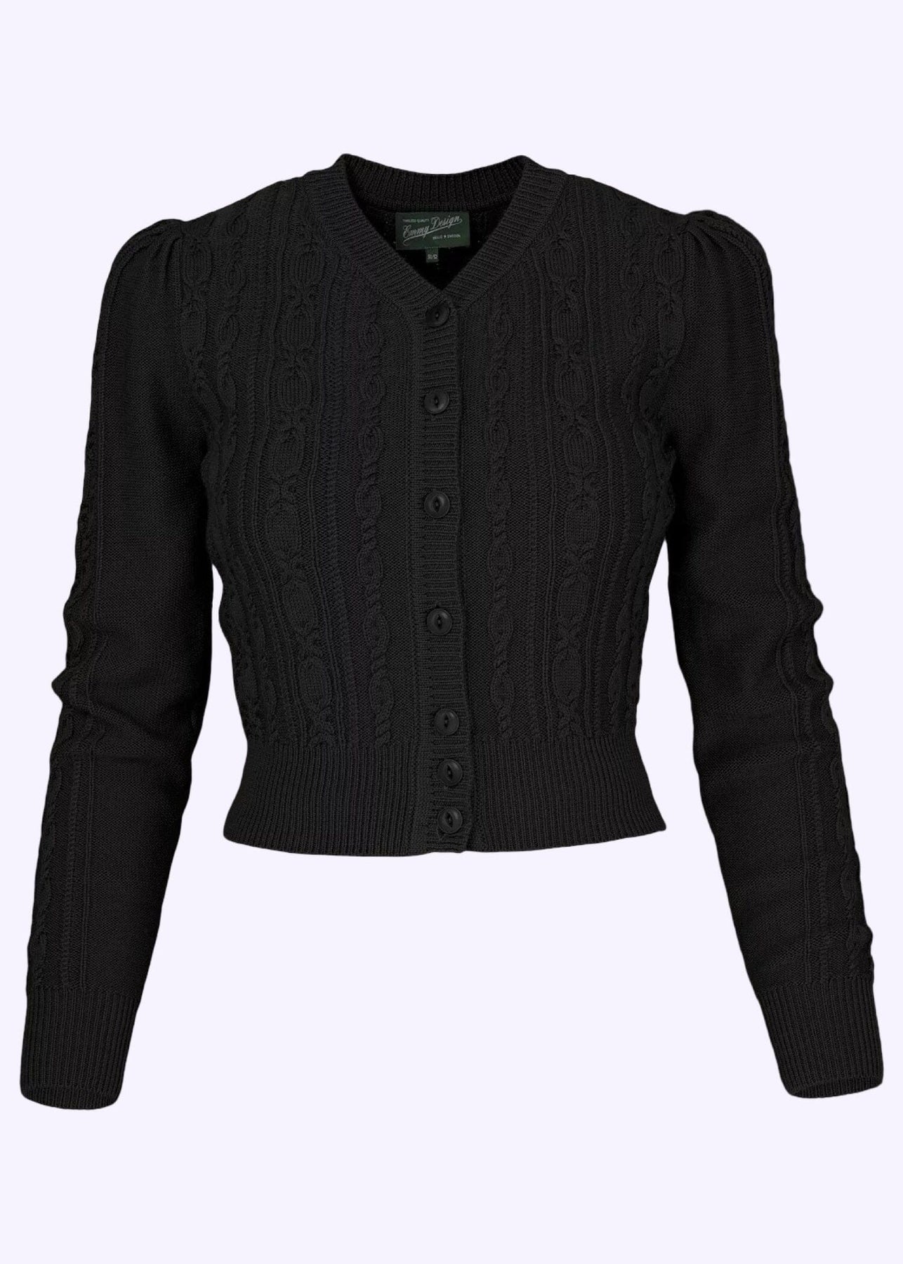 The Ice Skater cardigan er en favorit som ingen bør være foruden. Flatterende kabelstrik, puf ved skuldrene og høj halslukning giver den helt rigtige vintage vibe. Og så slutter den i taljen, og sidder ind til kroppen, så den passer perfekt til alle dine feminine retro- og vintage- inspirerede outfits, der har taljen og timeglas-silhuetten i fokus!