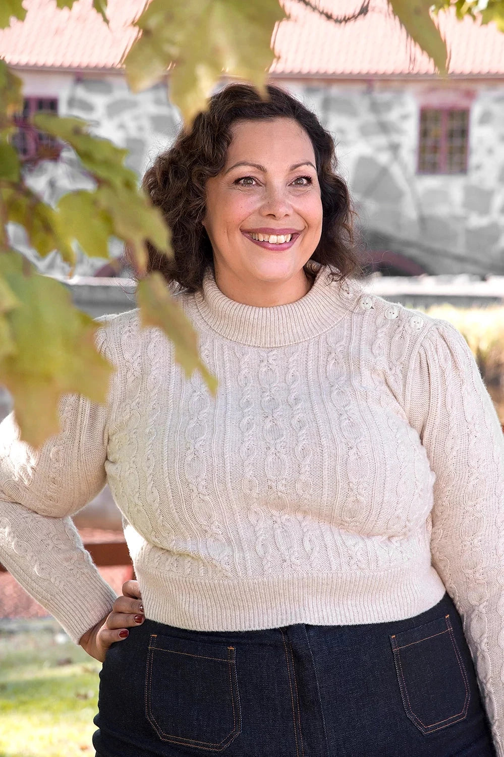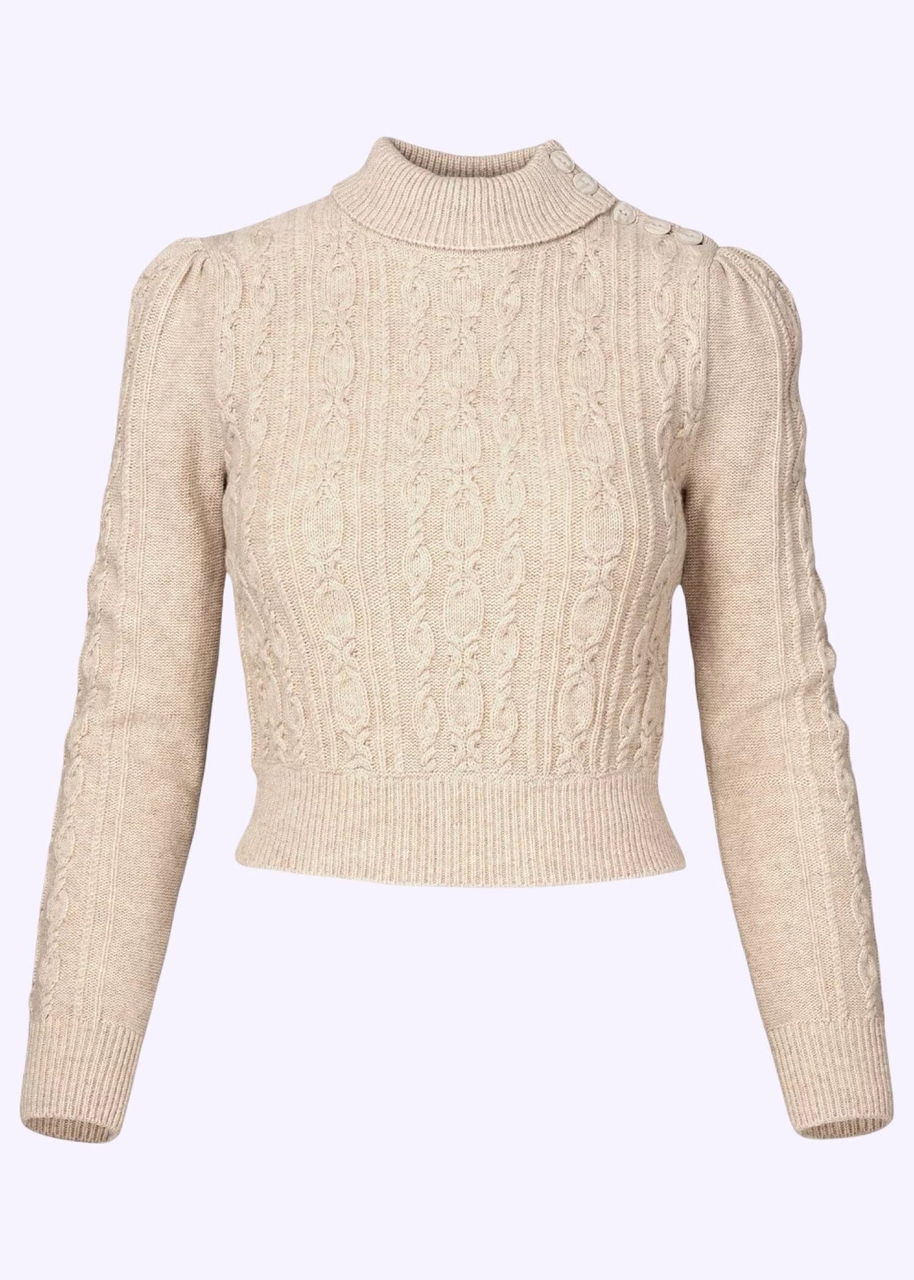 Ice Skater Sweater har en høj hals med en ombukket krave som sidder flot i halsen. Sweateren lukkes i siden med en knaprække som går fra halsen og ud på skuldren i autentisk og elegant vintage stil.
