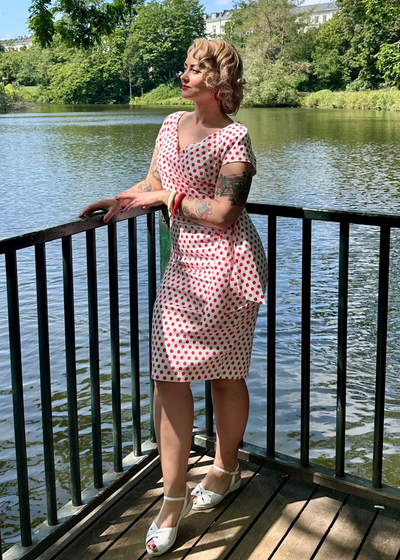 1950'er Hourglass pencil kjole - hvid med røde prikker