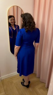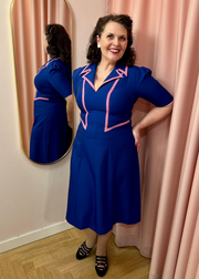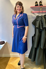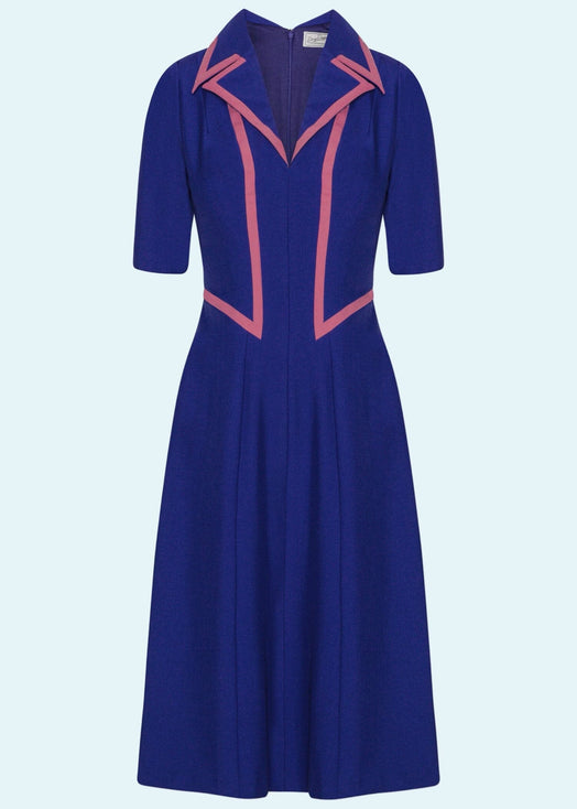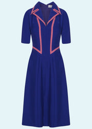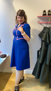 Kjolen er med sin smukke kongeblå med pink detaljen en smuk og iøjefaldende kjole, som passer ind i din vintage garderobe.