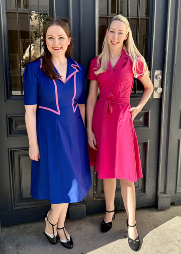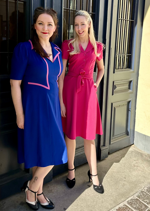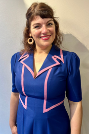 Den skønne Agnefried er tilbage hos Mondo Kaos. Kjolen har den flotte 1940'er stils krave som lukker til et elegant smalt V foran. Kraven har en flot kontrastkant i pink, og farven går igen i en bånd detalje ned foran på kroppen som har den samme skarpe vinkel som kravespidserne, og giver en elegant artdeco- vibe.