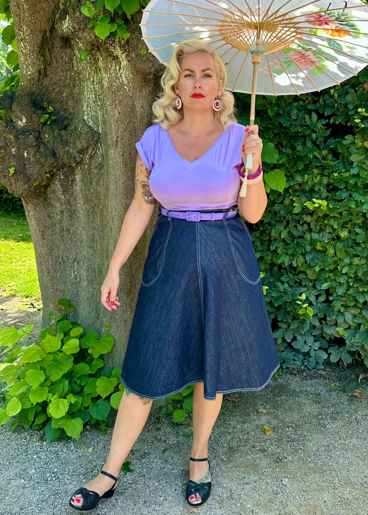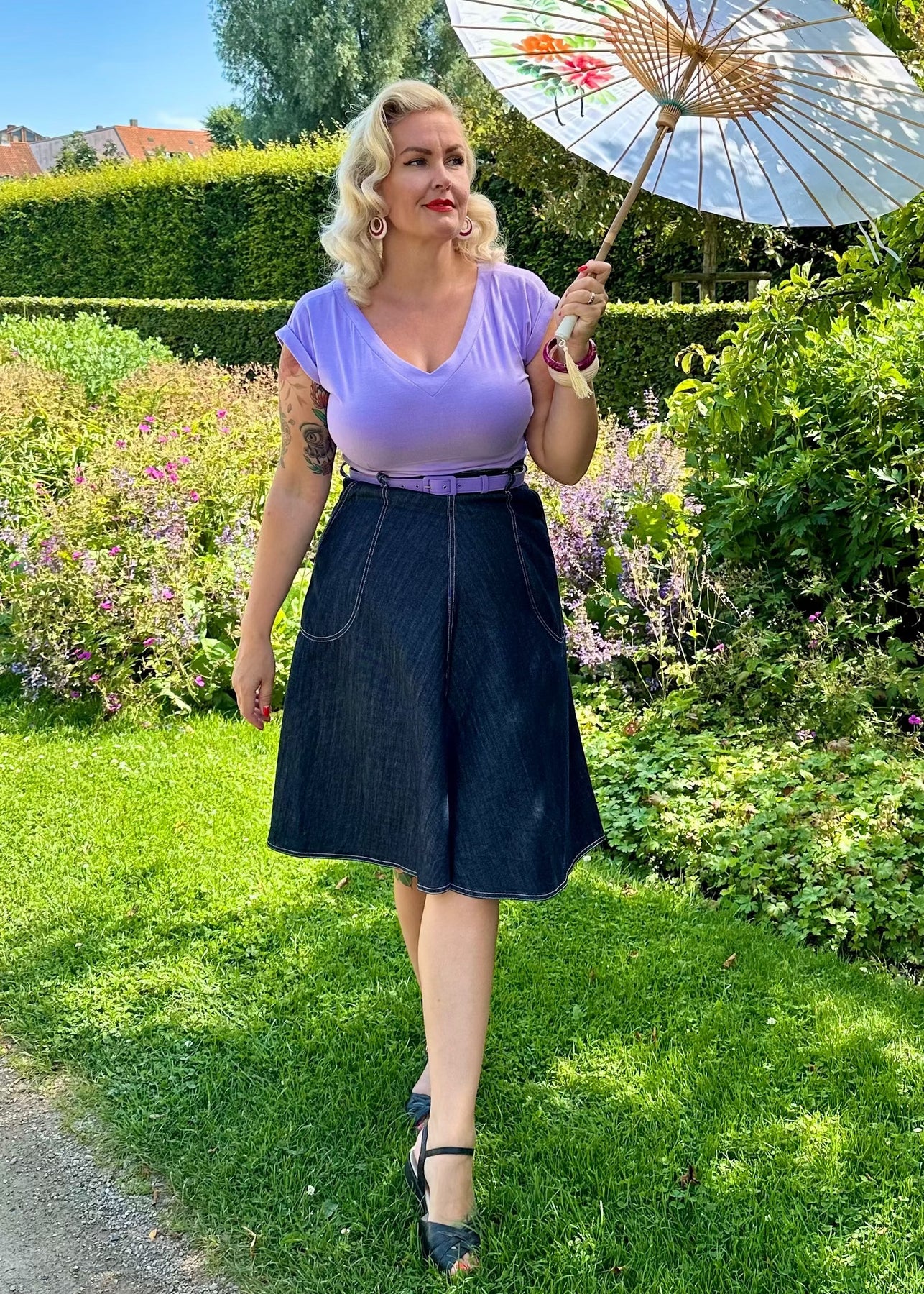 Nederdelen er i kraftig denim, og den lukkes med lynlås i siden. Denne nederdel har bare det helt rigtige vintage rockabilly look.