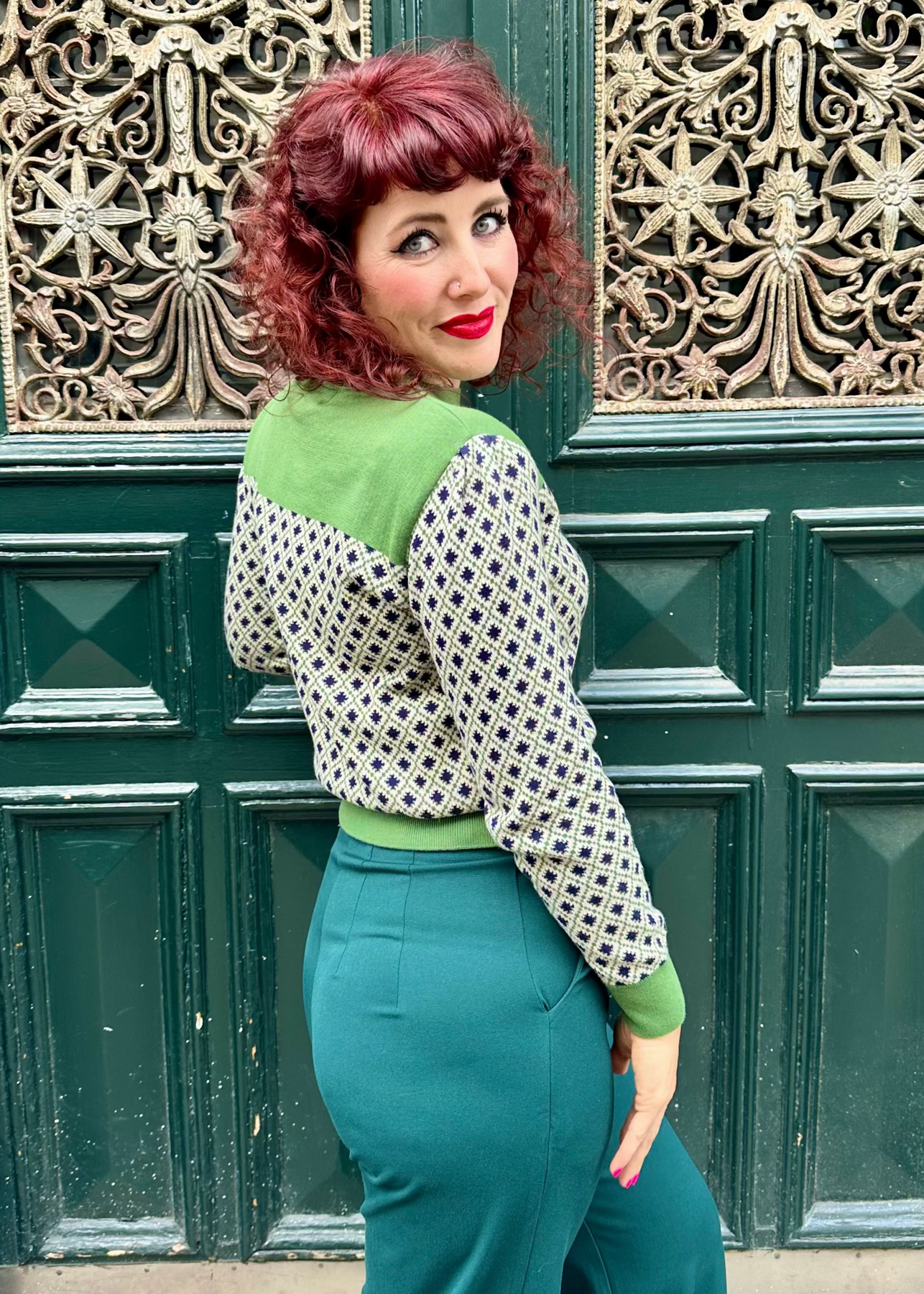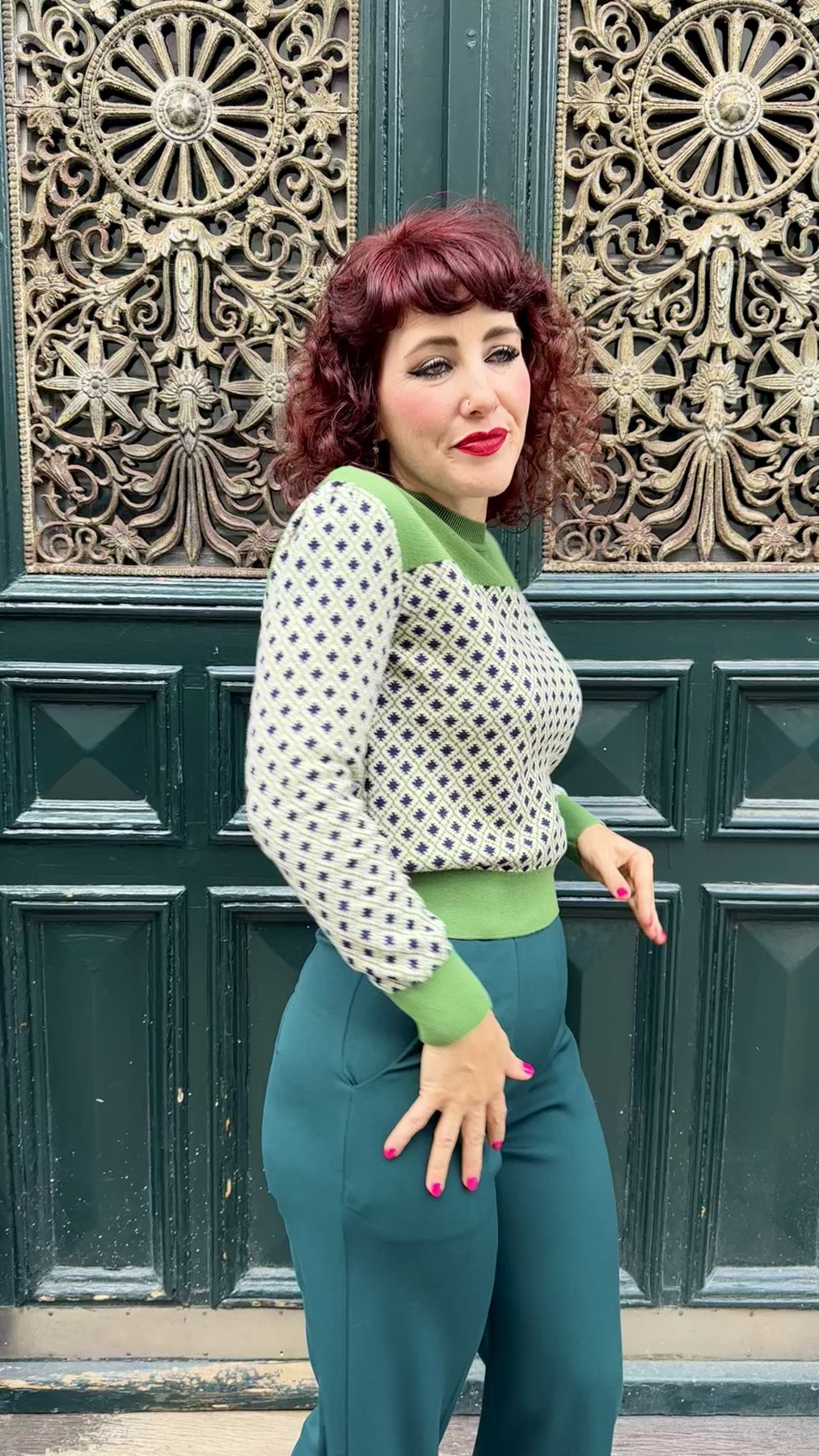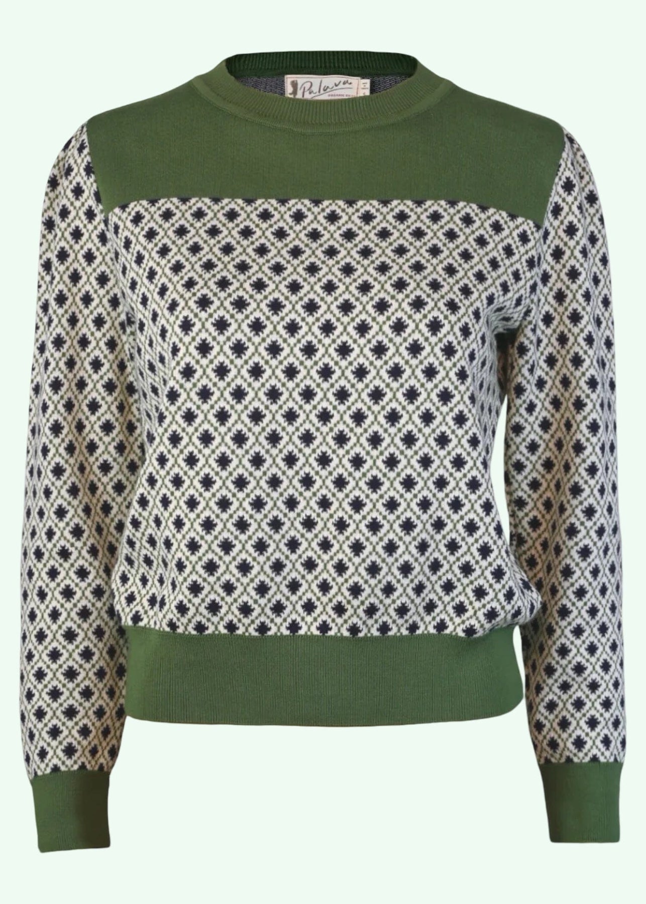 Mød den nye strikbluse, Clara. Inspireret af klassiske vintage-strik byder hun på et smukt blåt "ternet" mønster kombineret med en smuk grøn ved hals samt ribkanter..