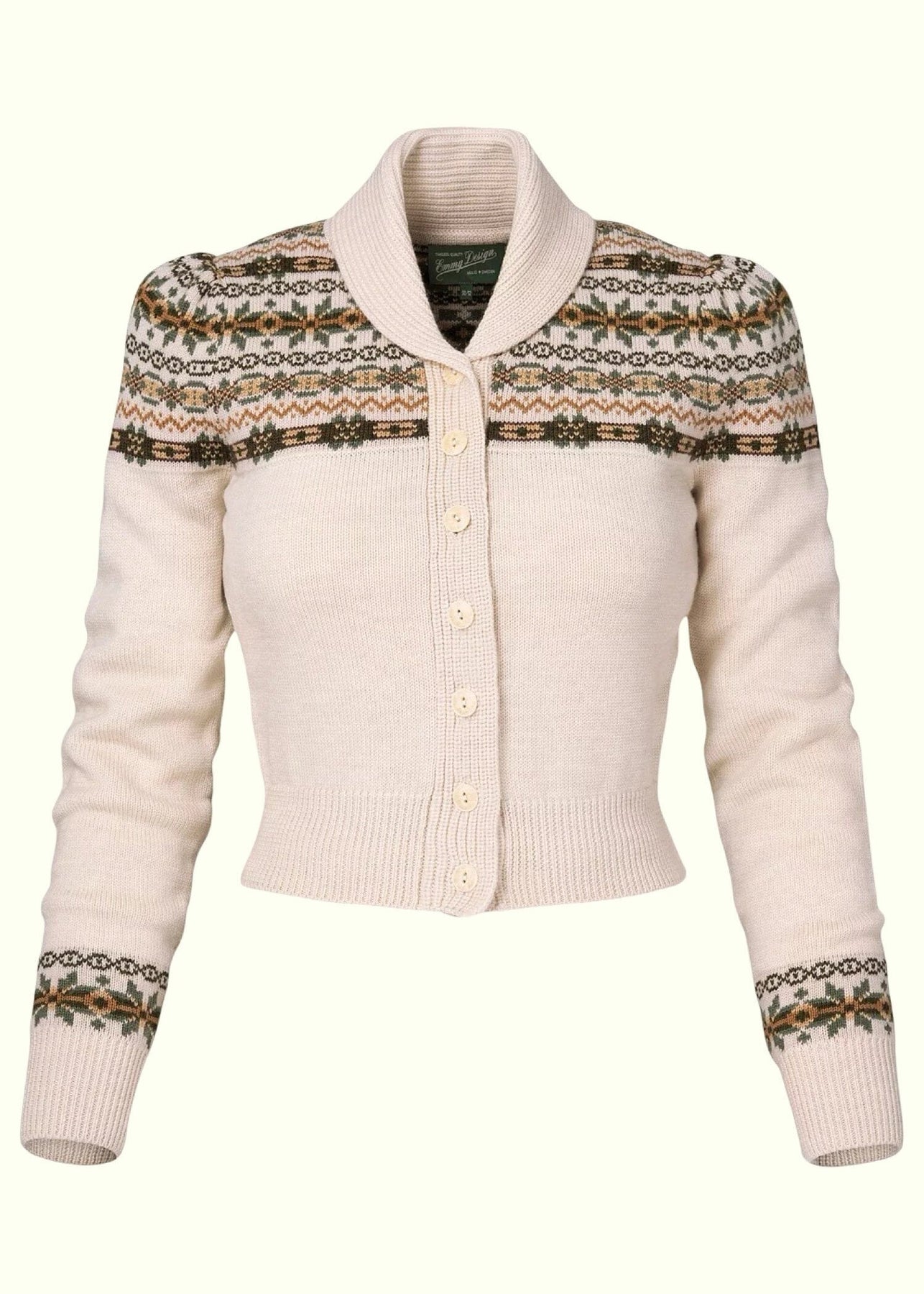 De smalle ærmer har puf ved skuldrene og har det fine fair-isle stjerne mønster lige inden ribkanten. Cardiganen har den sædvanlige cropped længde, så den slutter i den naturlige talje, og den sidder naturligvis flatterende ind til kroppen, og egner sig dermed perfekt til din vintage garderobe.
