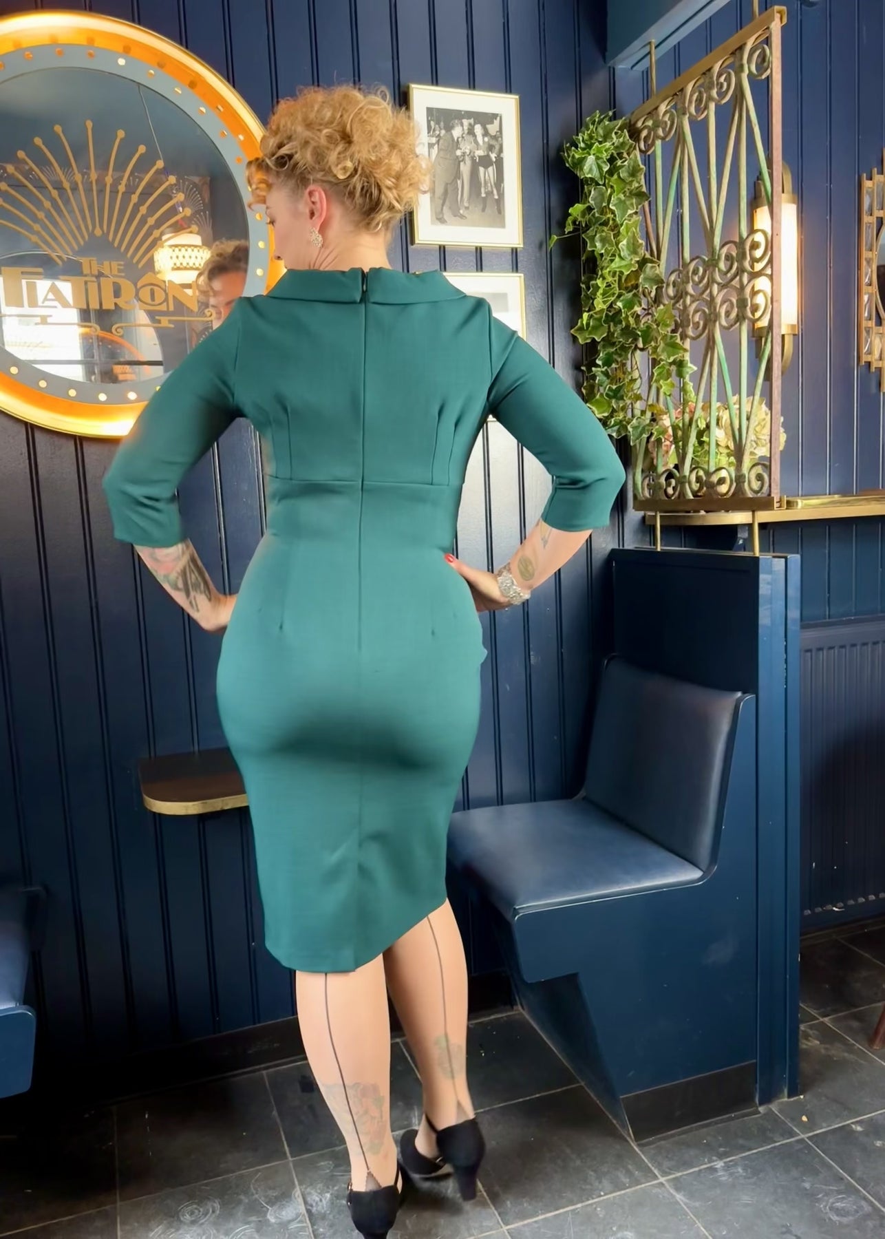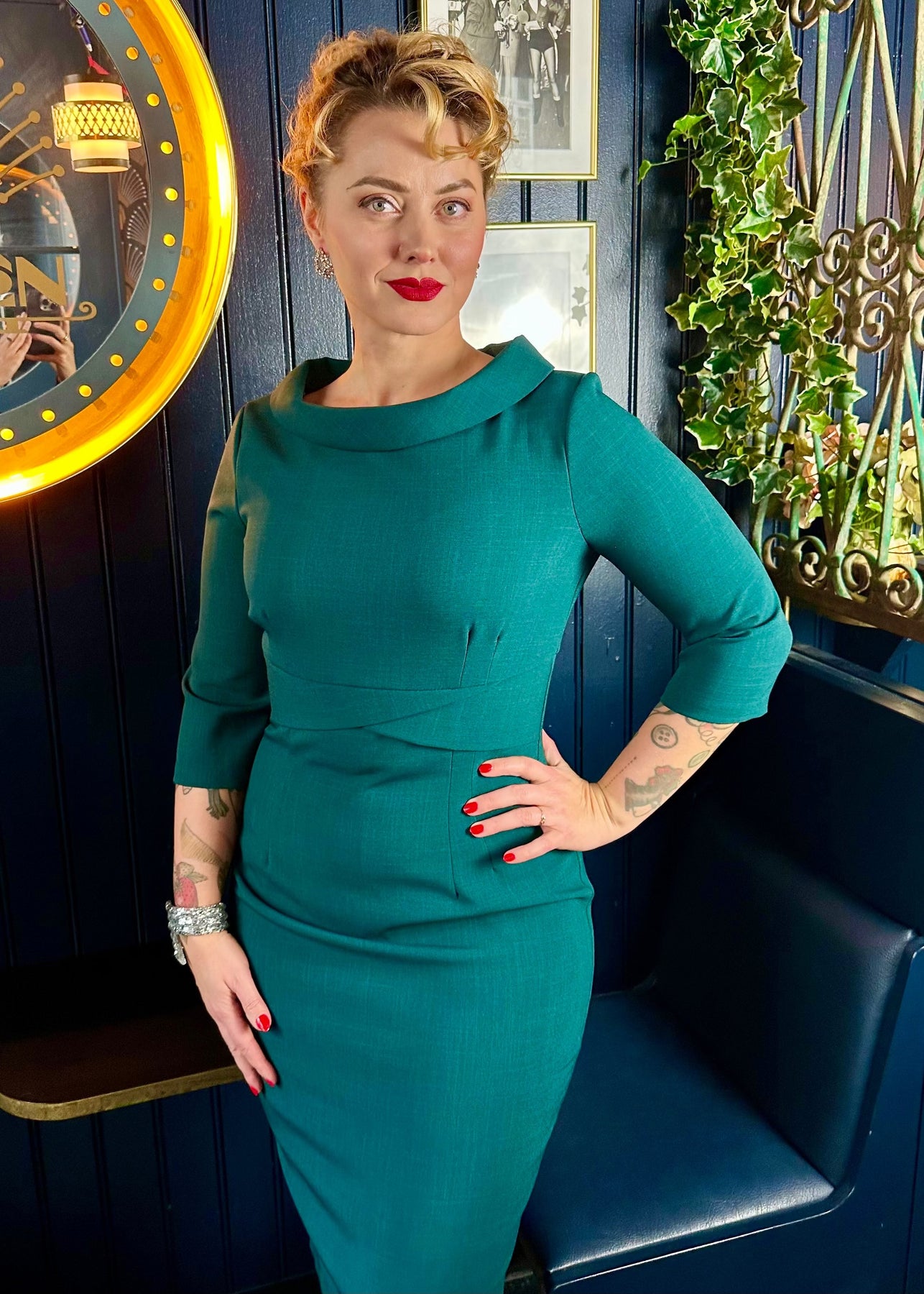 Den smukke Kennedy Roll Collar Pencil Dress fra The Pretty Dress Company er indbegrebet af sofistikeret vintage elegance. Designet er inspireret af Jackie Kennedy-Onassis’ klassiske stil og kombinerer det bedste fra 1950’ernes skræddersyede snit med moderne komfort.