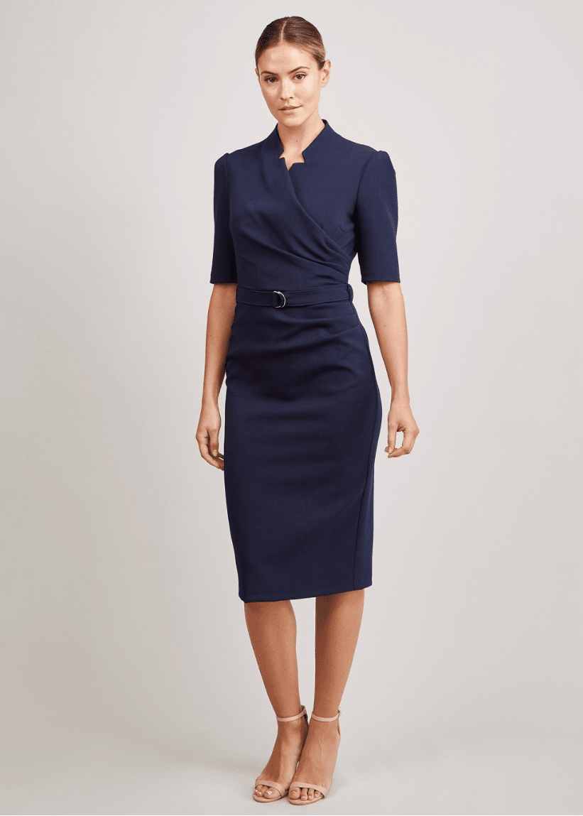 De midtlange, formsyede ærmer giver et sofistikeret udtryk, og den knælange pencilnederdel med slids bagpå sørger for, at du kan bevæge dig frit – uden at gå på kompromis med det elegante look.