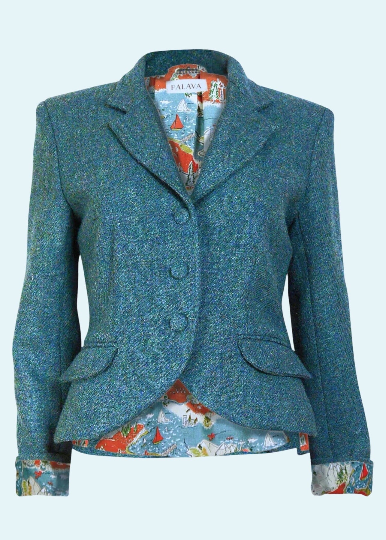 Med dette i tankerne er jakken blevet genskabt efter samme høje standarder – i autentisk Harris Tweed, foret med originale Palava-print. Denne model i teal er foret med bomuld/linen-stoffet Treasure Maps.