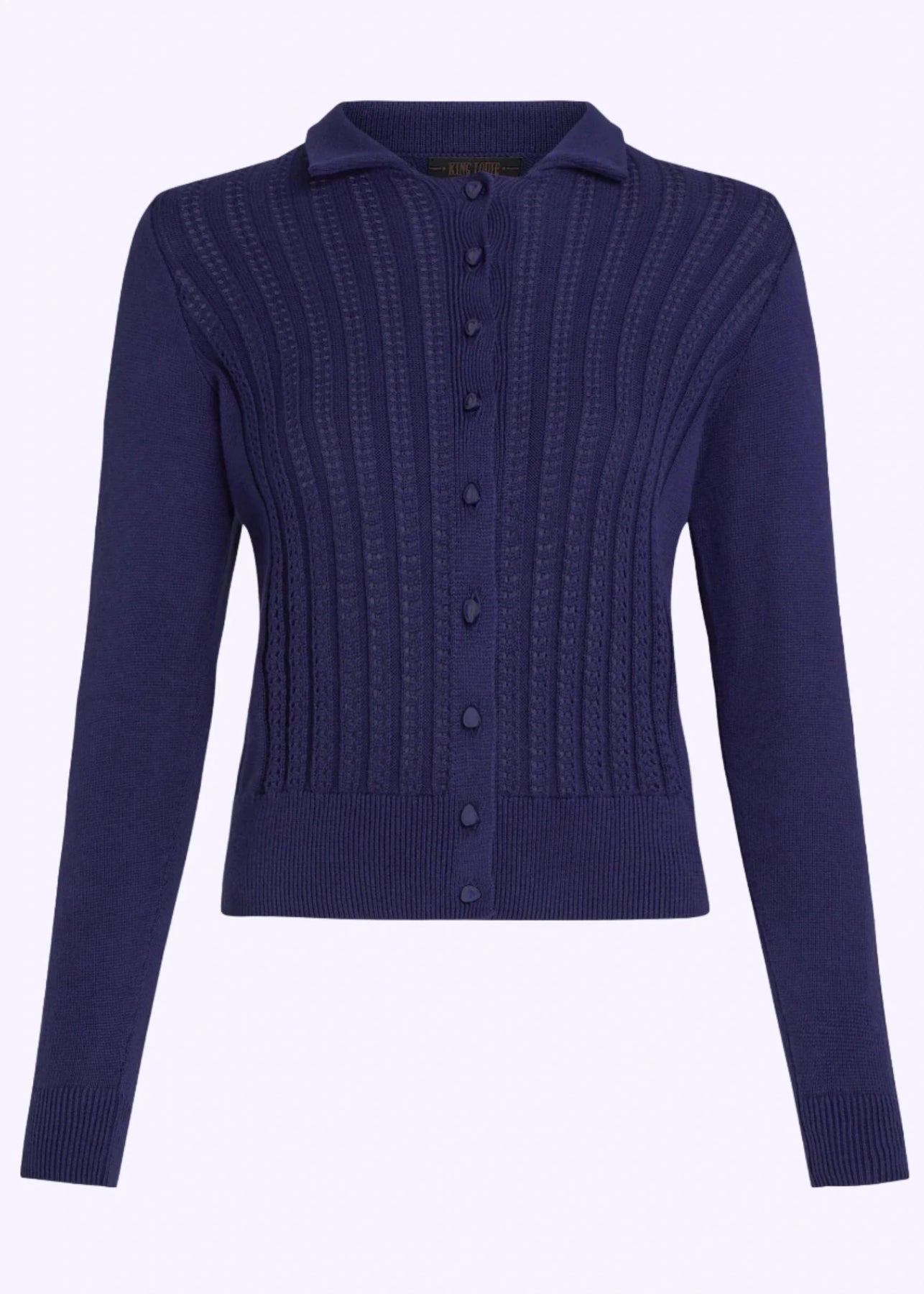 Sofie cardigan har en lille blusekrave og kan lukkes helt op i halsen. Foran har cardiganen et elegant hulmønster, som går igen i en enkelt bane ned langs de smalle ærmer. Bagpå ses hulmønstret på siderne, mens midten af ryggen er i et bredt ribmønster.