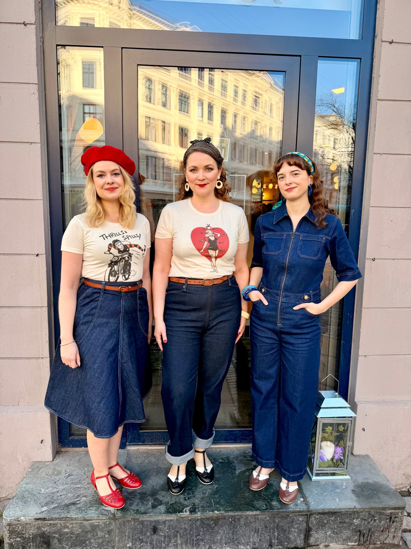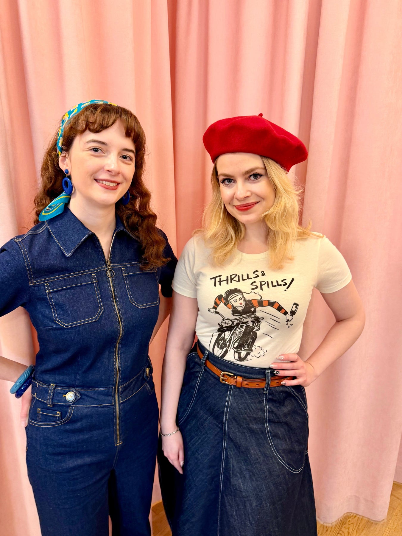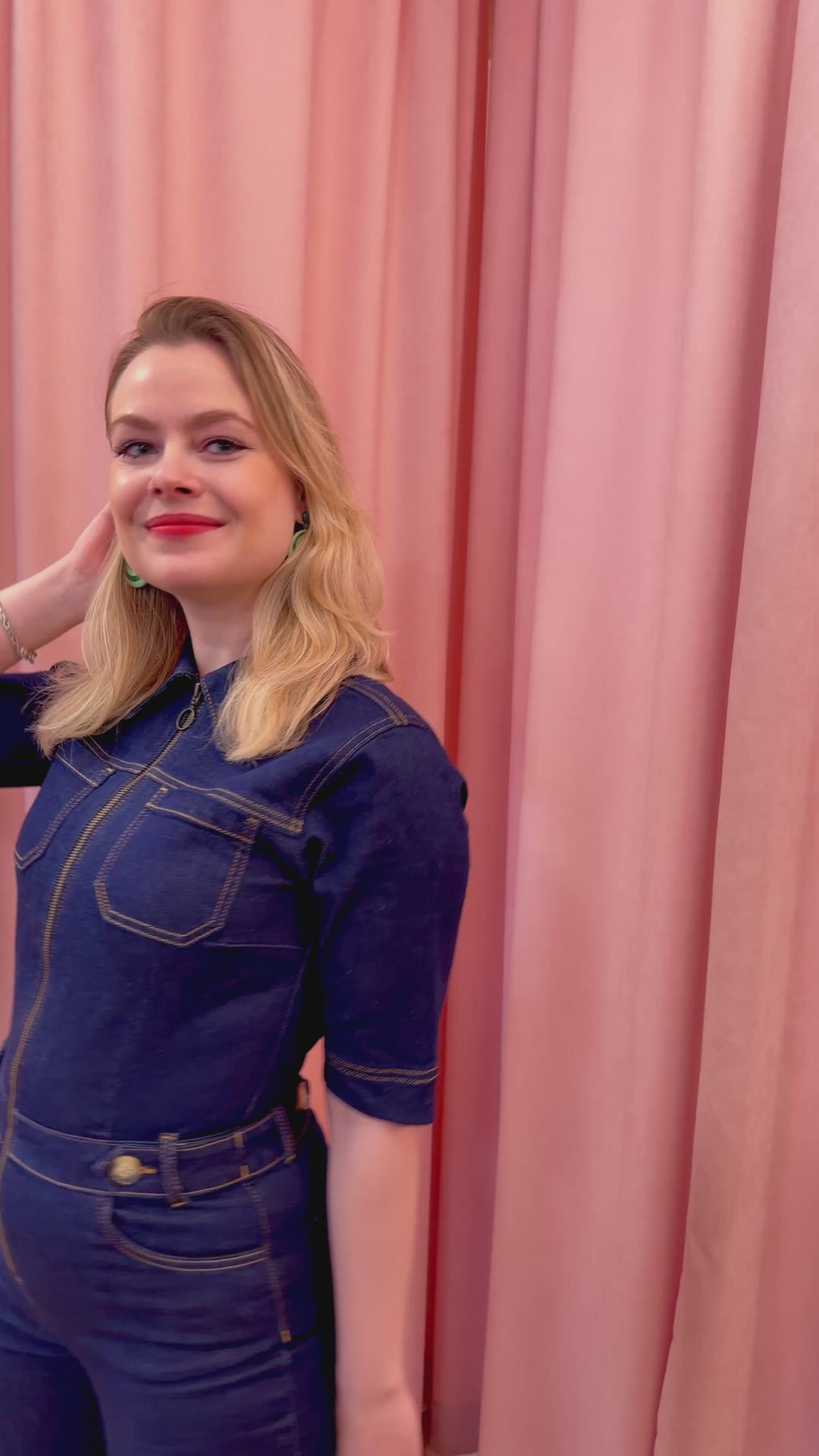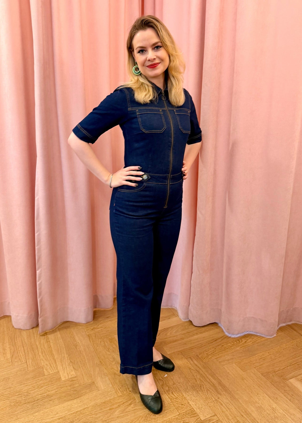 Den kraftige denimkvalitet har komfortabelt stræk, så buksedragten føles behagelig at have på hele dagen – perfekt til både hverdag og mere afslappede, festlige anledninger. Style den med sneakers for et cool hverdagslook eller med hæle og røde læber for et mere feminint retro-udtryk.