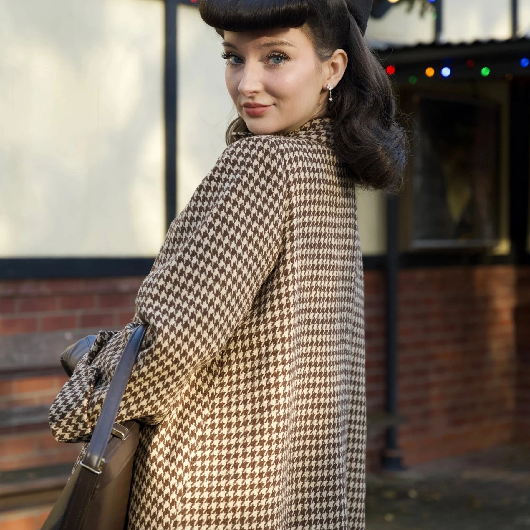 Ærmerne er brede i det, med ligeledes det bred opsmøg. Der er små skulderpuder som gør at frakken sidder lige ved skuldrene, og giver frakken det rigtig 40'er snit. Frakken er i en vintage stils A-line, som falder smukt og elegant om kroppen.
