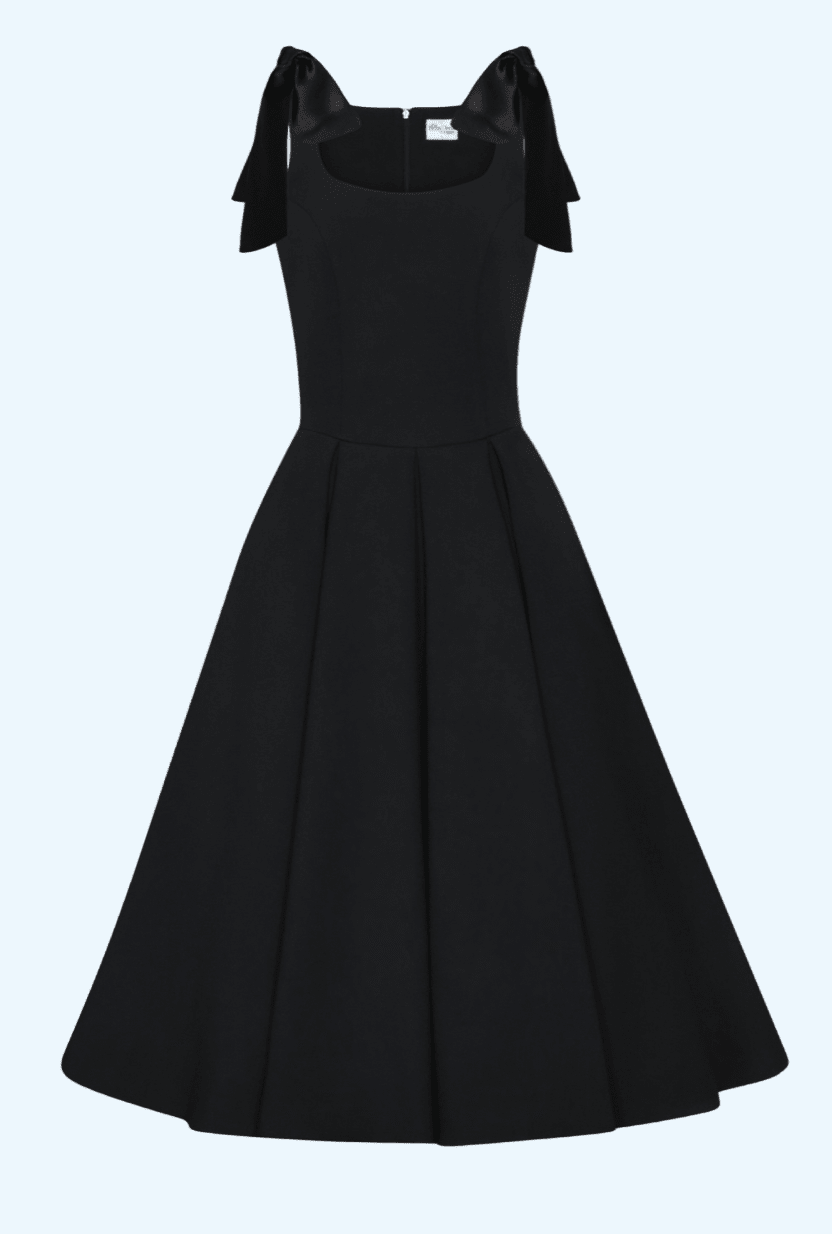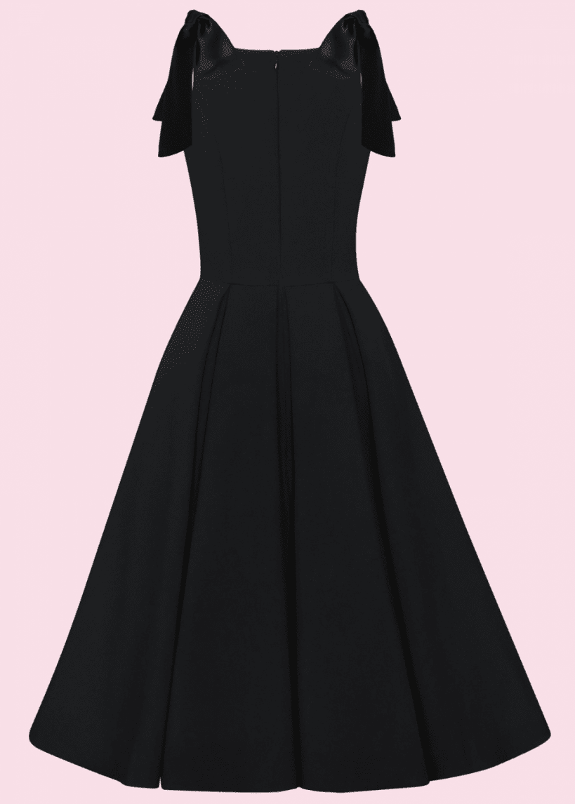 Den sorte farve gør kjolen utroligt alsidig — den kan styles dramatisk med høje hæle og røde læber, eller mere hverdagsvenligt med flade sko og en lille cardigan. Fjern satin-sløjferne for et mere minimalistisk look eller bær kjolen lag-på-lag over en bluse for en retro-inspireret styling.