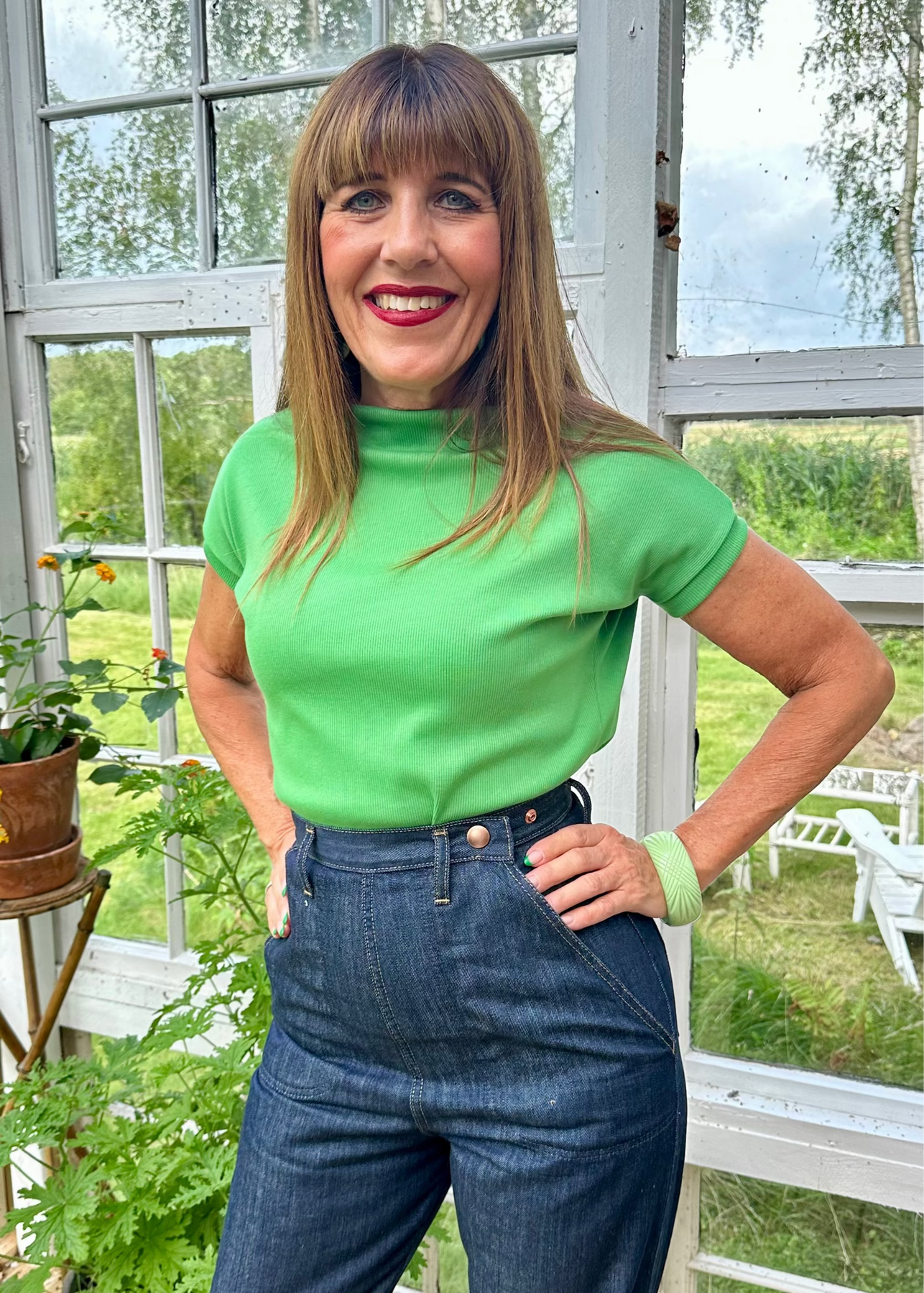 Ærmerne er kendetegnede ved ikke at være påsyede, men at gå ud i et med resten af toppen, hvilket giver det helt særlige look. Ærmerne afsluttes med en smal ribkant som giver et flot hold.