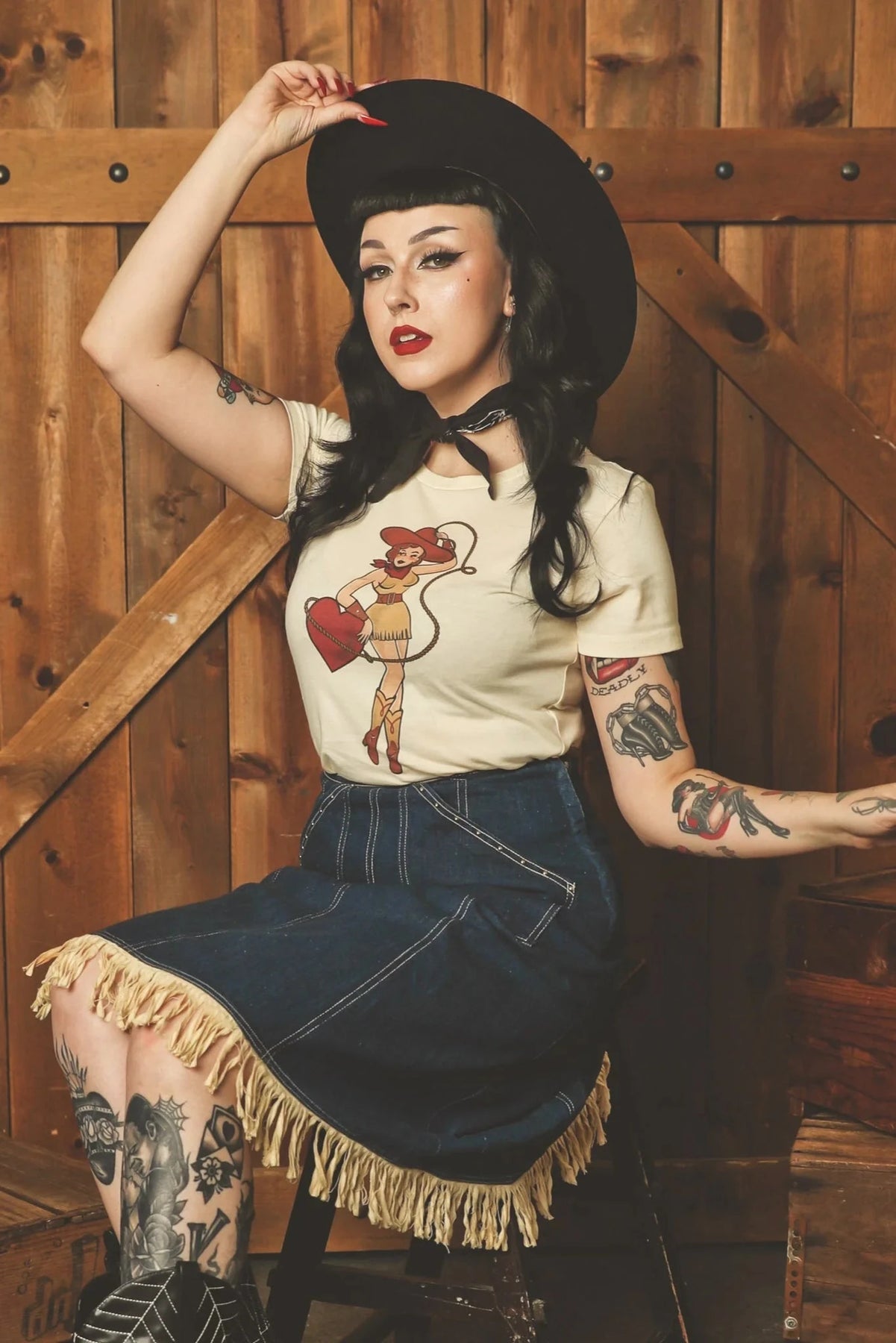 Heart Bandit er en af de skønne pinup damer iført cowgirl outfit og en lasso som fanger et stort hjerte. Er du til country og western, måske en ægte Dolly elsker? Så er her T-shirten til dig!