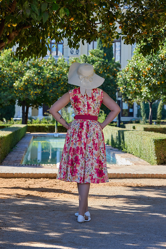 Den smukke Alya-Mai kjole fra Miss Candyfloss emmer af feminin elegance og klassisk vintage charme. Med sit florlette fald og romantiske blomsterprint i fuchsia, lilla og koral toner på en blød off-white base, er den skabt til forår og sommerens særlige øjeblikke.