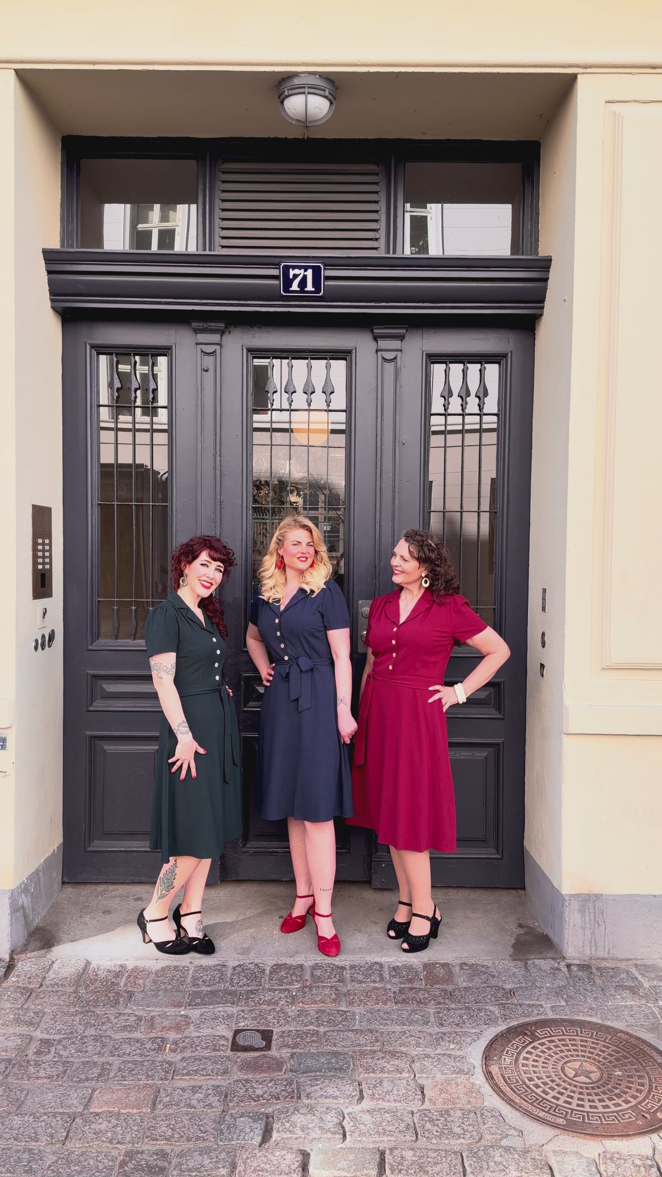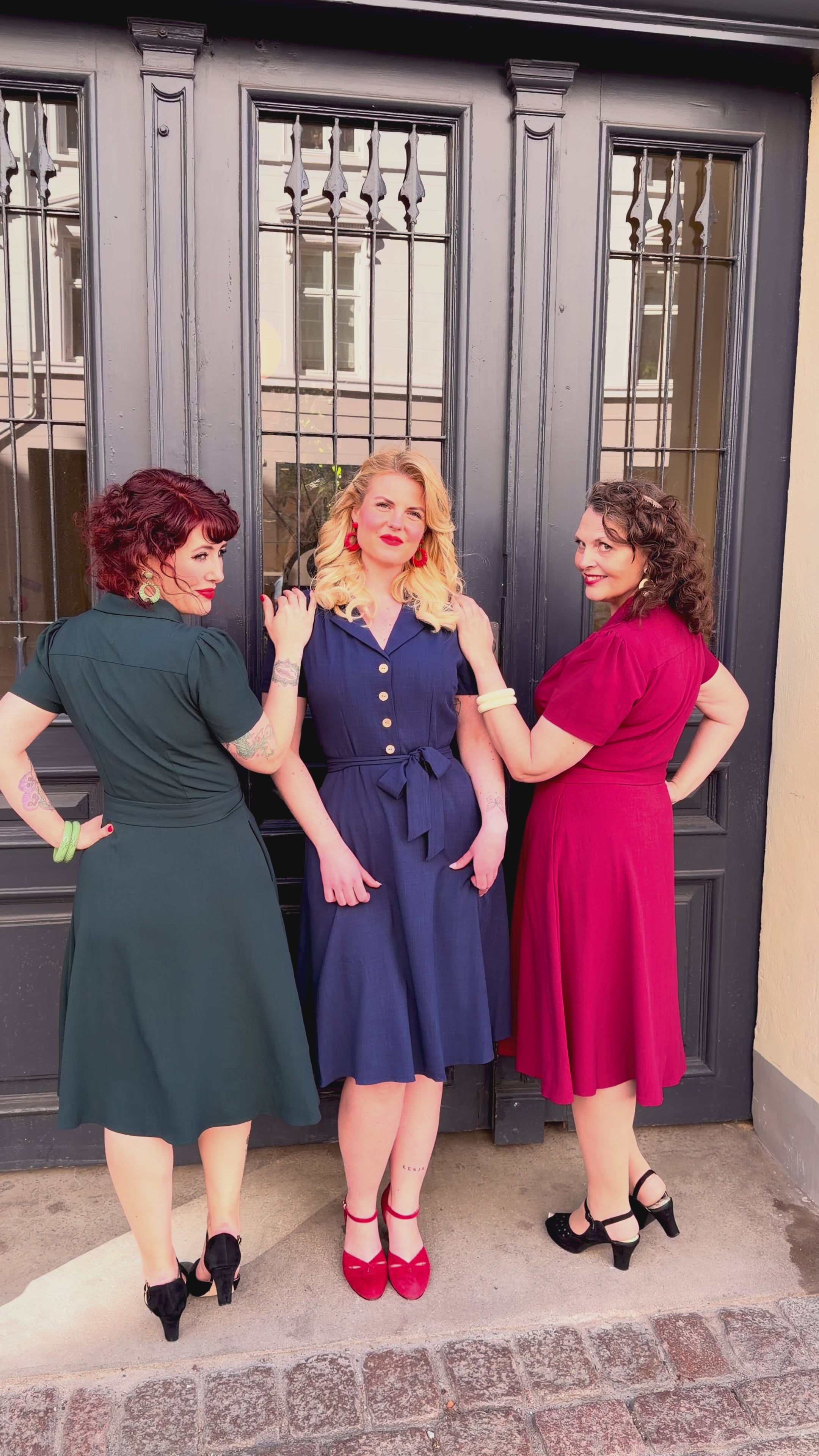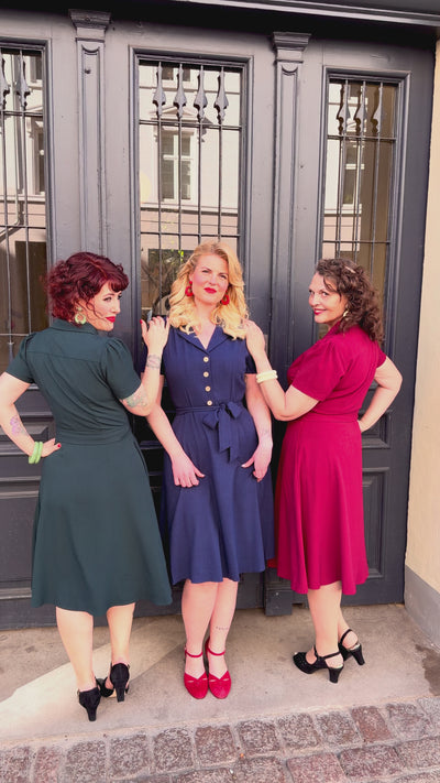 Diskret rynk ved skuldrene giver den nødvendige plads over barmen, mens bindebæltet highlighter taljen der skaber den klassiske vintage stils hourglass silhuet.