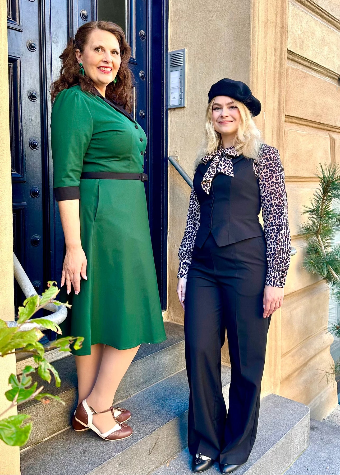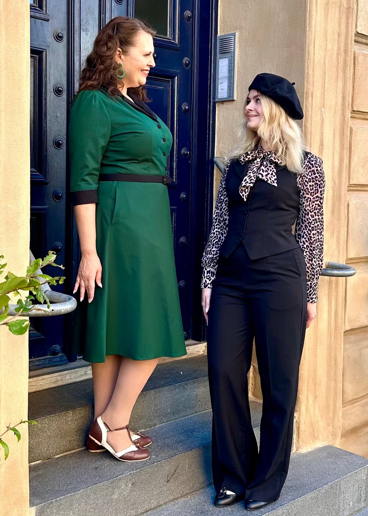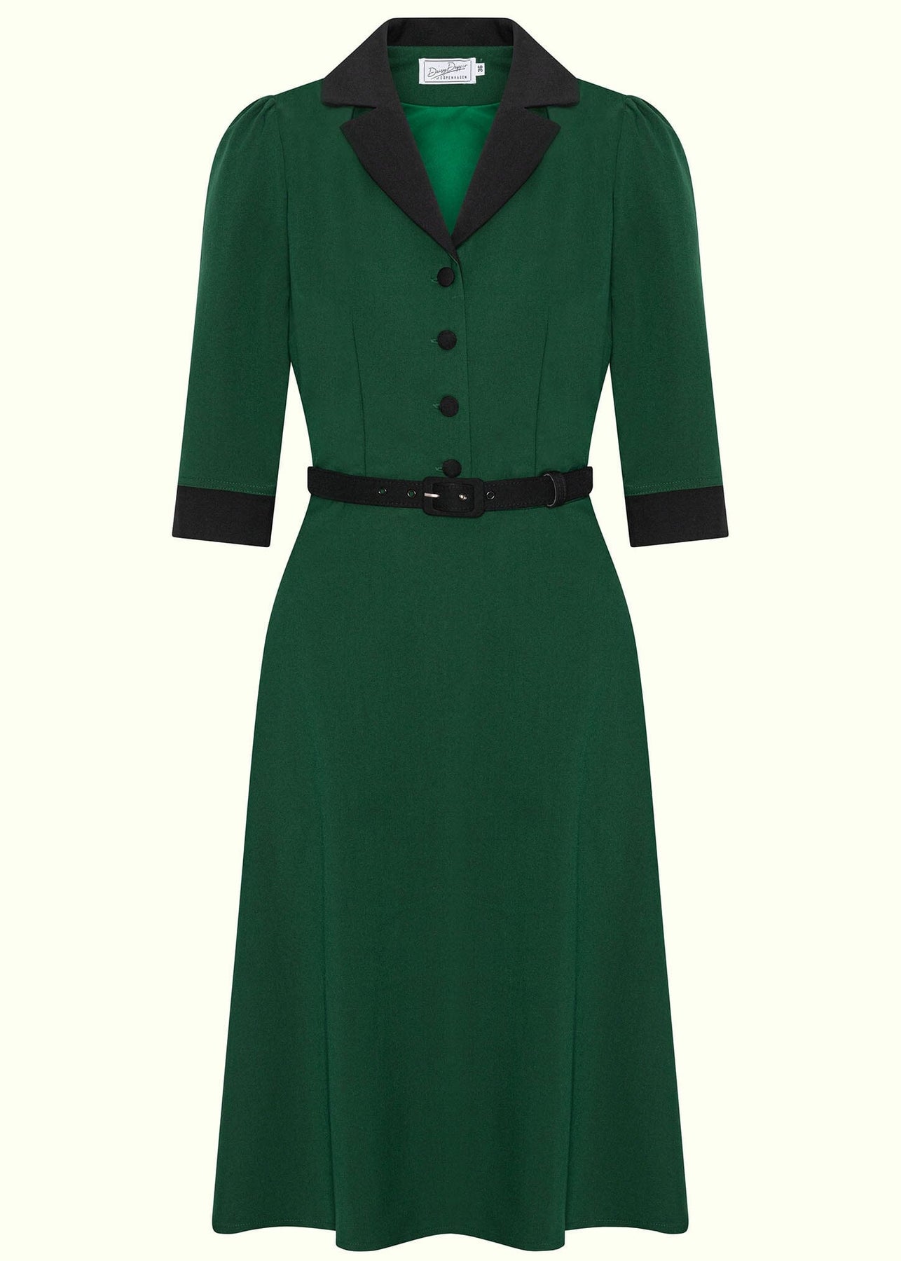 Betty skjortekjolen fra Daisy Dapper er indbegrebet af vintage elegance – en smuk, figursyet kjole med fokus på pasform, detaljer og det klassiske timeglas-snit. Den mørkegrønne farve kombineret med sort kontrastkrave og sorte knapper giver kjolen et eksklusivt, tidløst udtryk med et strejf af retro glamour.