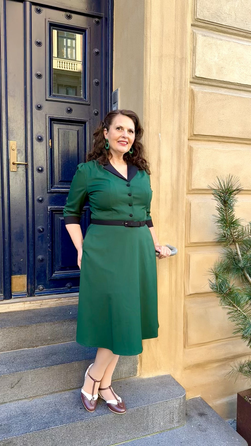 Vintage stils skjortekjole i mørkegrøn med sort kontrastkrave