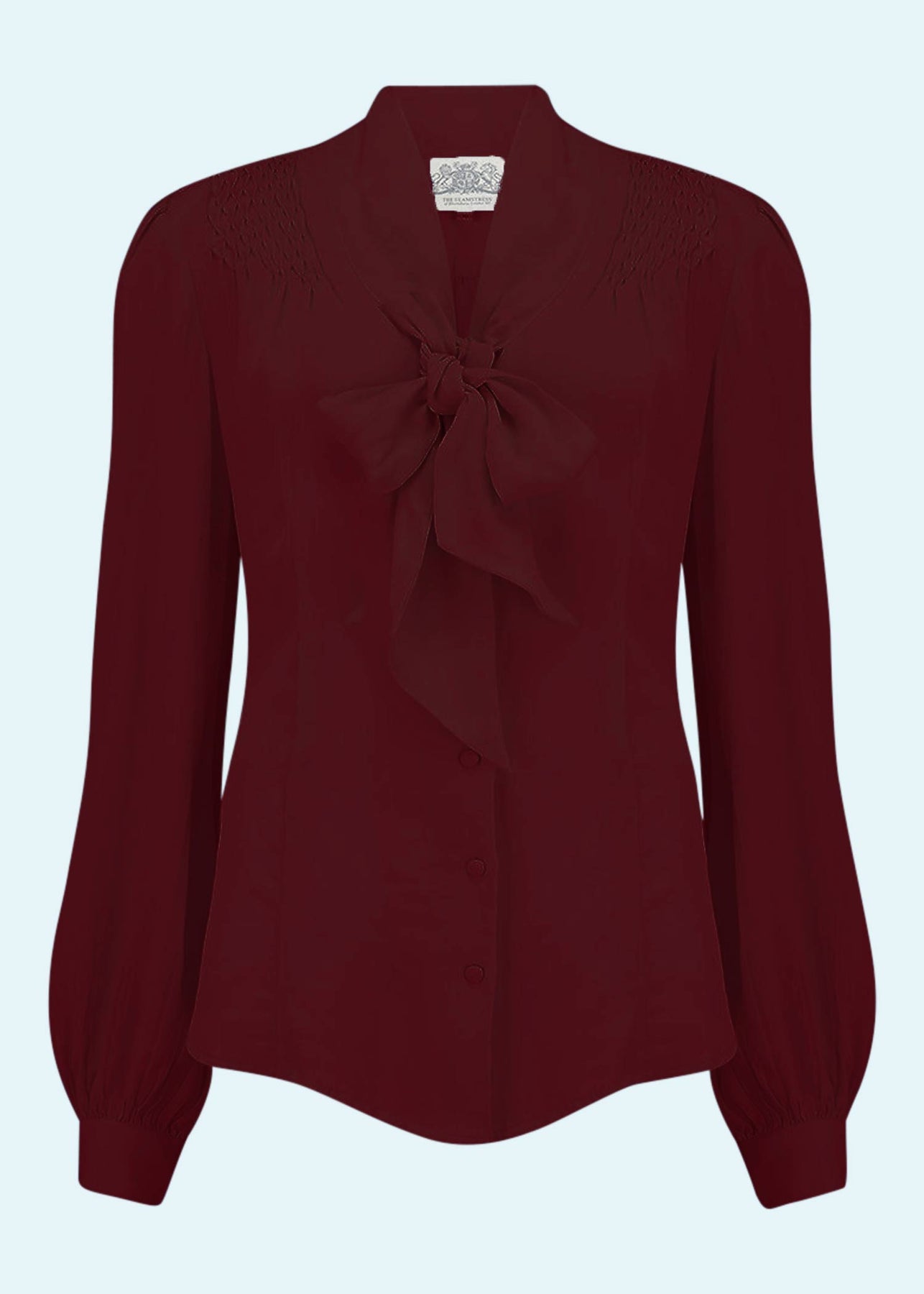 Blusen har lange fyldige ærmer og en feminin bindesløjfe i halsen. Den er let figursyet, og sammen med de små skulderpuder skaber blusen den ikoniske timeglas-silhuet med fyldige skuldre og slank talje. Desuden har denne skønne skjorte, fine "smock" detaljer ved skuldrene hvilket giver et klassisk vintage look.