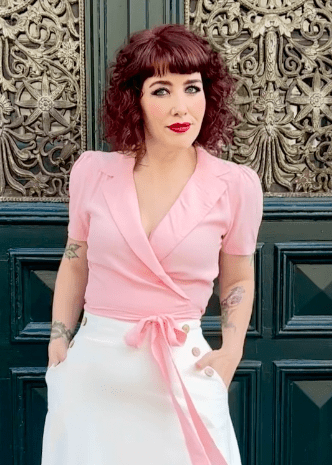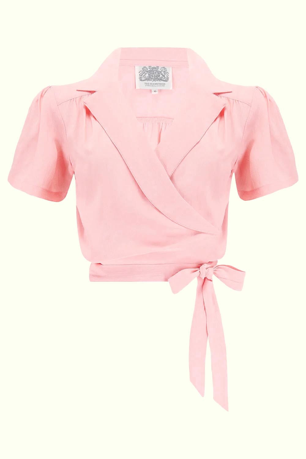 1940'er stils slåom skjortebluse i pink med reverskrave og korte ærmer fra The Seamstress of Bloomsbury.