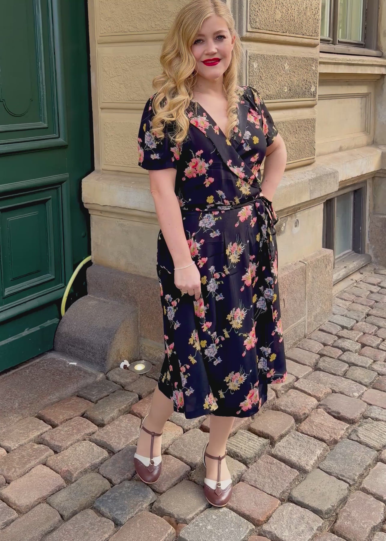Skøn slåom kjole i autentisk vintagestil i sort med blomsterprint fra The Seamstress Of Bloomsbury.