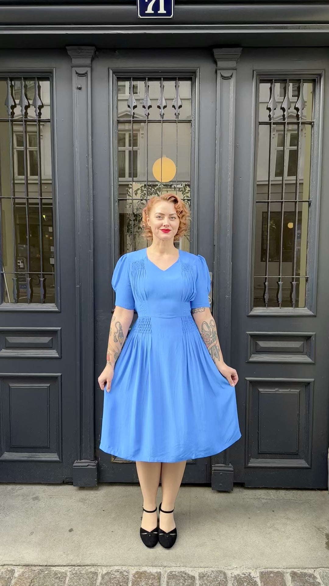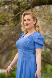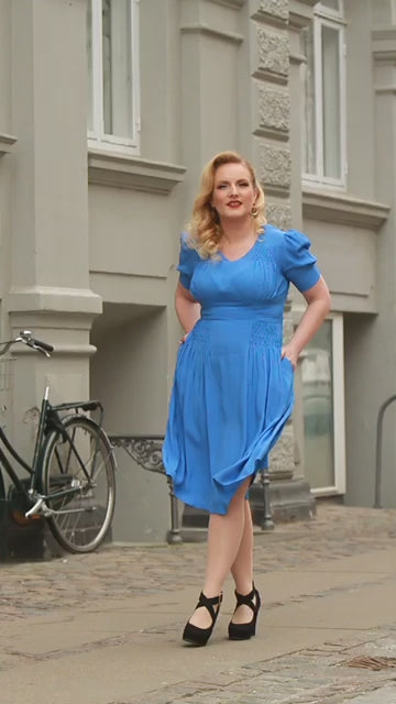 Sidst, men ikke mindst, giver den smukke Palace Blue farve masser af vintage charme til denne skønne kjole.