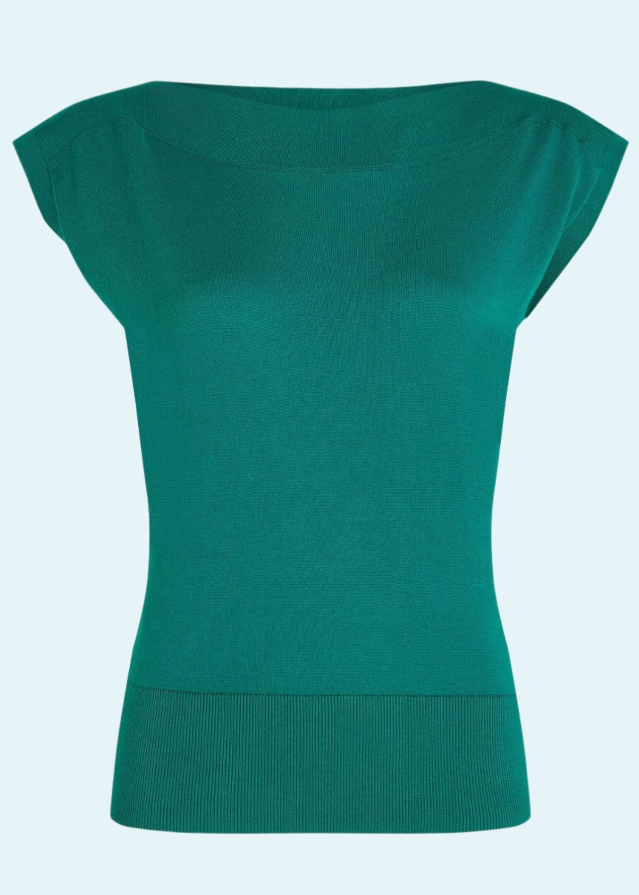 Denne turkis grønne strik top emmer af enkel retro elegance. Toppen har en smuk, bred båd-udskæring, der fremhæver hals og skuldre på en sofistikeret måde. De korte "cap sleeves" og det strækbare strikmateriale gør den både komfortabel og stilfuld.