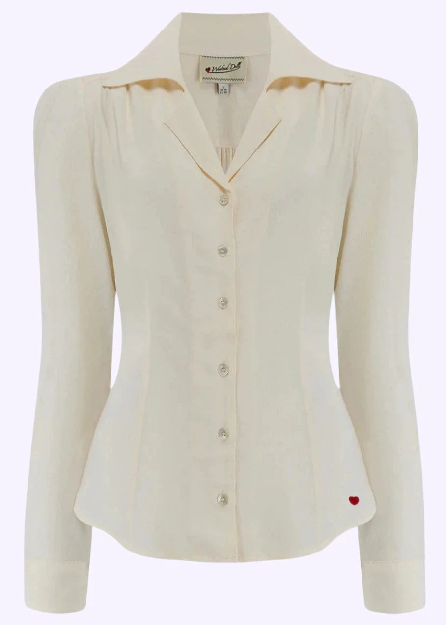Den fine Gene skjorte har den klassiske reverskrave i autentisk 1940'er stil som lægger sig flot udover skuldrene, og elegante perlemorsknapper ned foran.