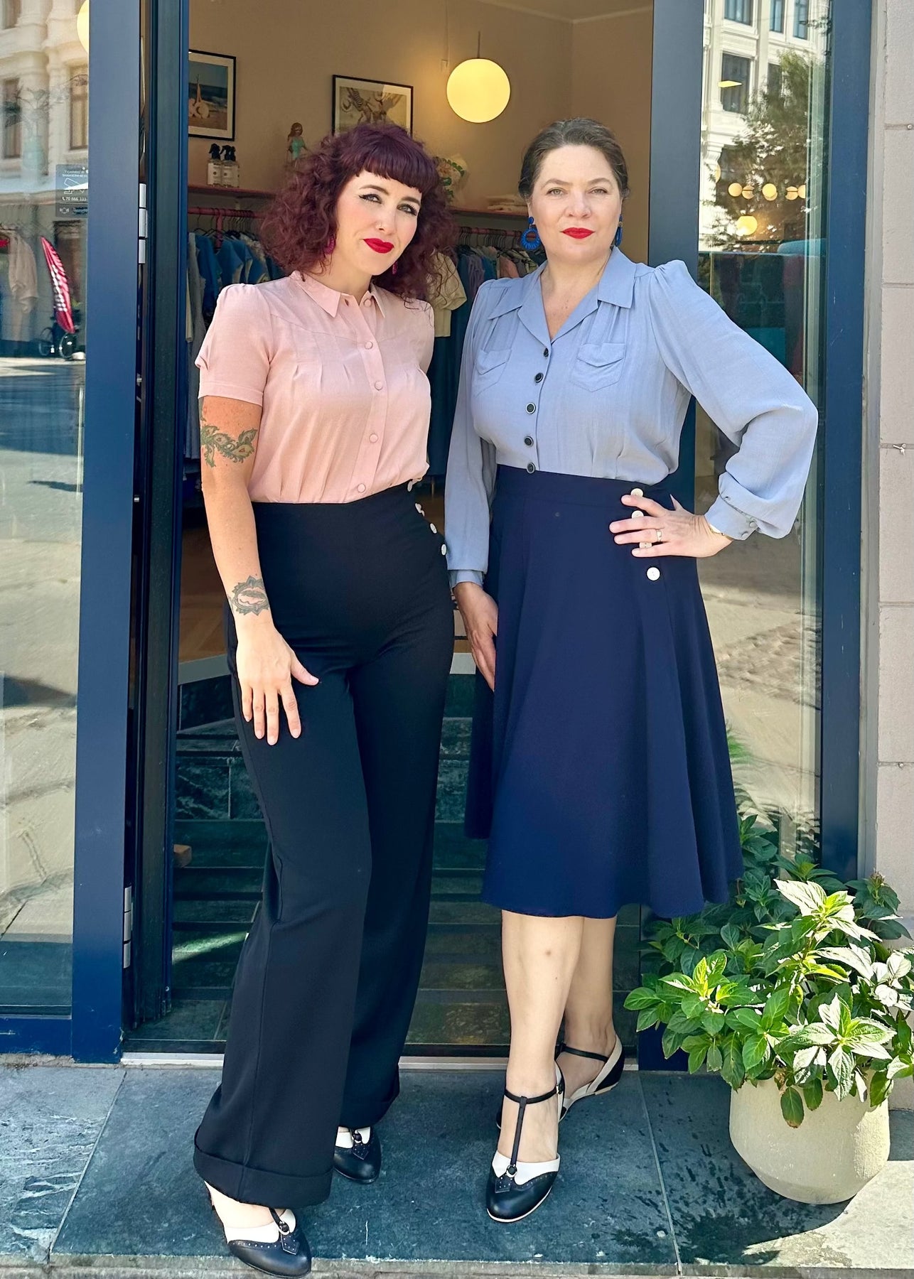 Skjorten har en sød lille krave, og kan knappes helt op, med de fine betrukkede knapper. Ærmerne har små ekstra læg ved skuldrene for lidt ekstra fylde, og et autentisk vintage look. Skjorten har læg ved barmen og på ryggen, før den igen ved hjælp af indsnit, giver en perfekt taljeret figur.