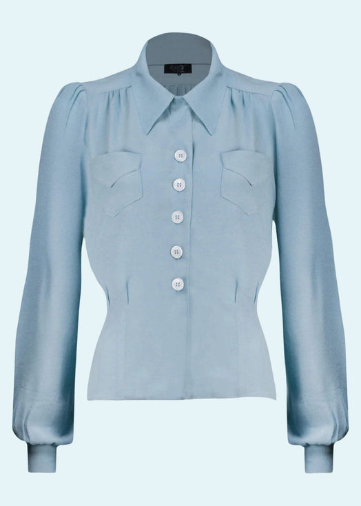 Pris 799,00 krElegant skjortebluse fra The House of Foxy i lys blå/ powder blue med 1940'er stils bishops ærmer.
