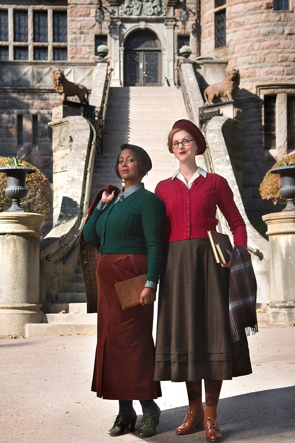 En skøn cardigan i ægte vintage stil med flatterende kabelstrik, puf ved skuldrene og høj halslukning. Og så er den taljeskåret, så den passer perfekt til alle dine feminine retro- og vintage- inspirerede outfits, der har taljen og timeglas-silhuetten i fokus!