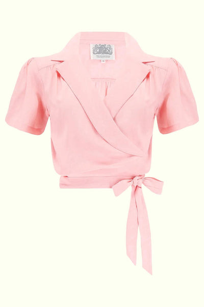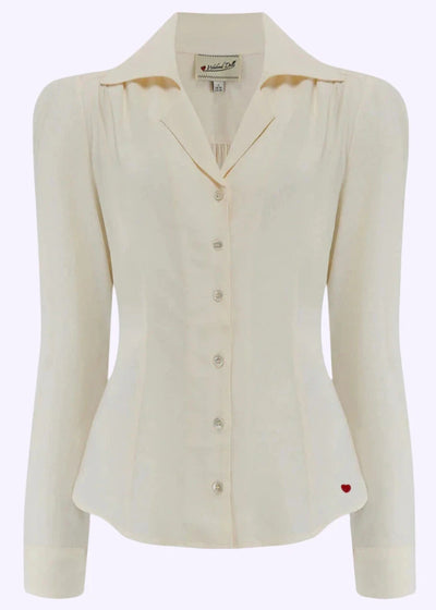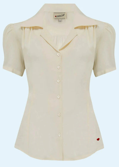 Den fine Ingrid bluse har korte løstsiddende pufærmer. Ved skuldrene er der rynk, så den falder smukt nedover barmen. V-halsen er omsluttet af et fint bindebånd, som kan bindes til sløjfe foran, for det skønne pussy bow look.