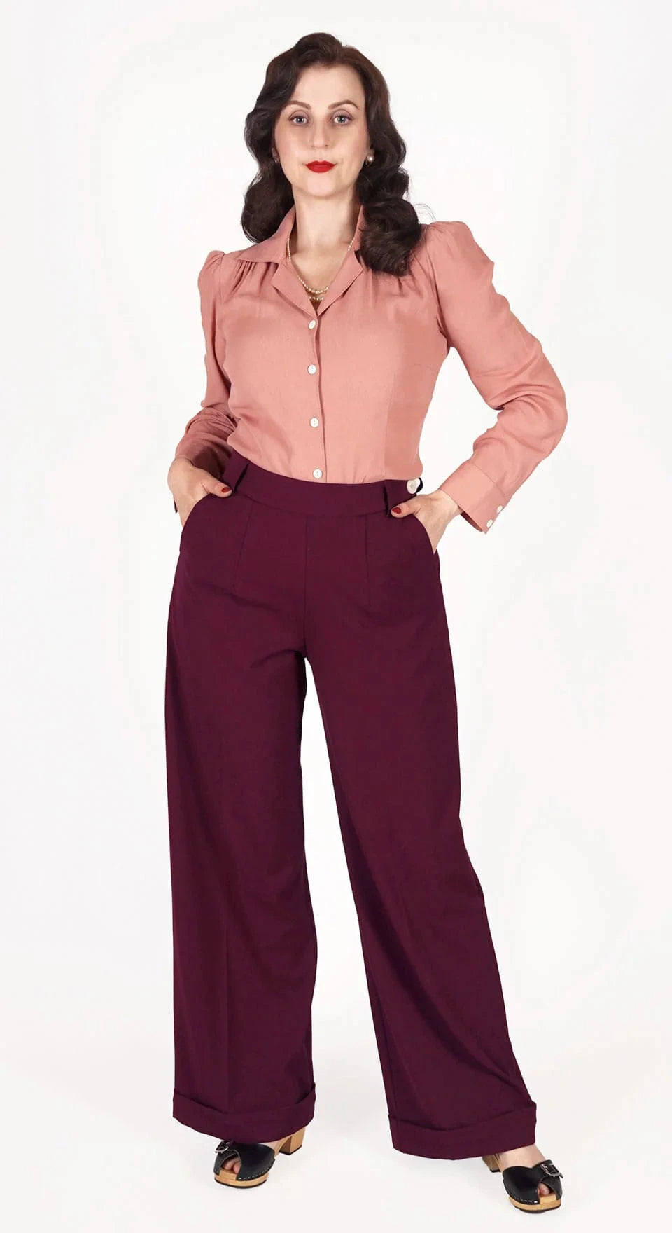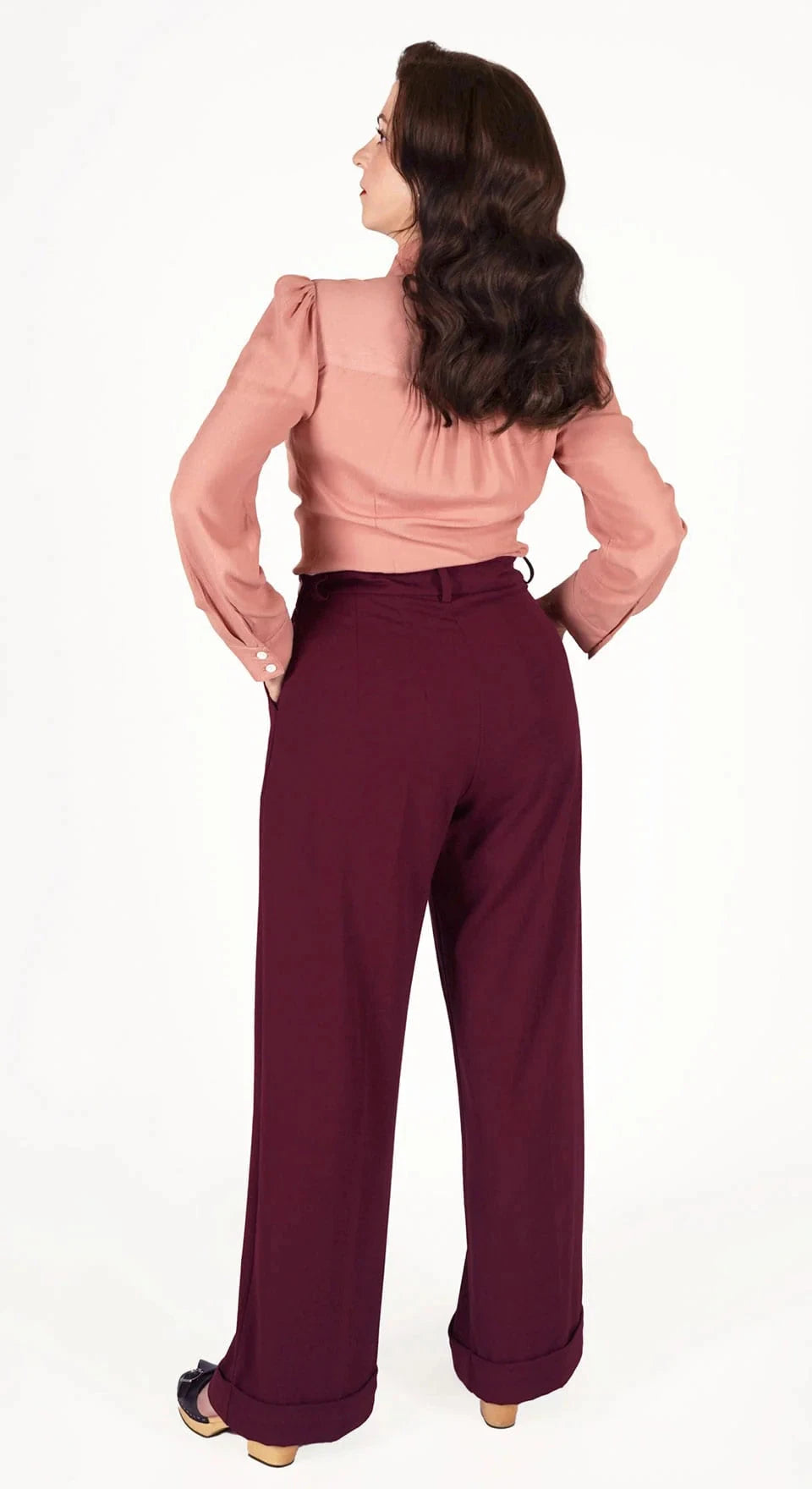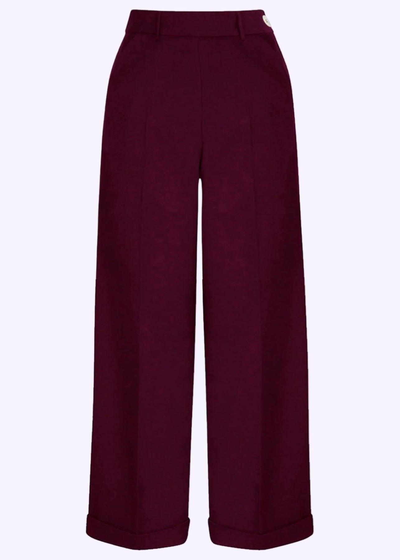 1940'er stils bukser med feminin sidelukning og flot vidde i benene i flot bordeaux.