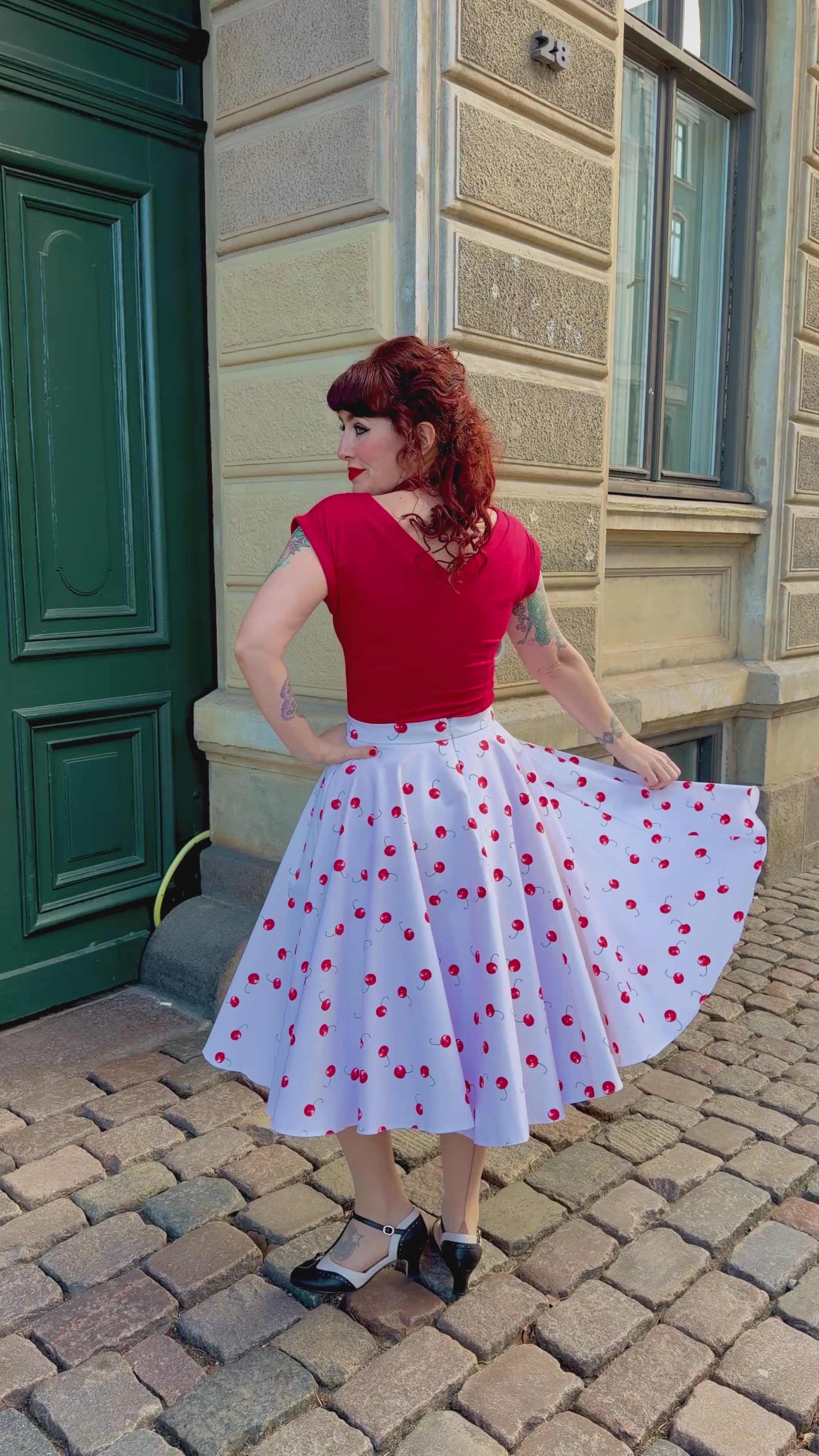Den enkle top har en sød båd-udskæring og en smuk V-udskæring, og så kan den vendes alt efter hvilken du ønsker skal være foran (se sidste video). Behagelig stretch jersey såvel som de enkle indsyninger, sørger for at toppen sidder indtil kroppen, så den egner sig perfekt til vintage looket med højtaljede nederdele og bukser, og er din perfekte go-to top.