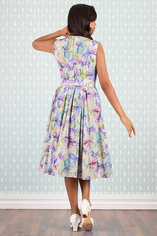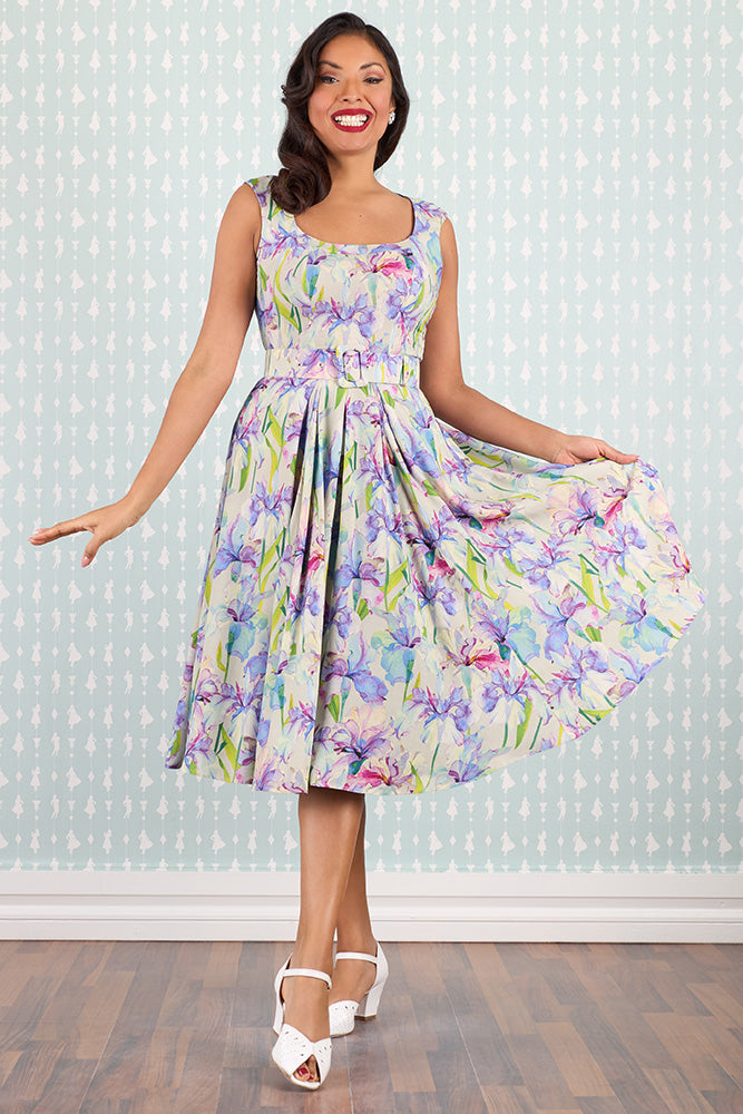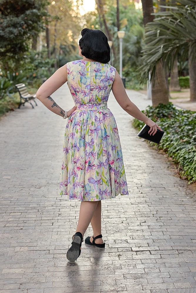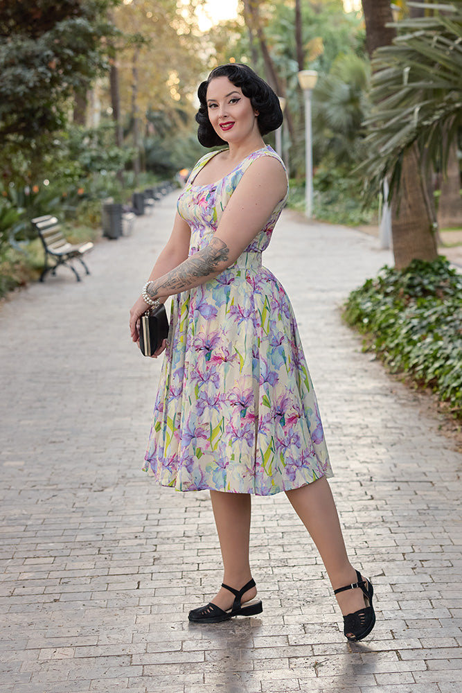 Denne smukke vintage inspirerede kjole er indbegrebet af feminin charme og tidløs elegance. Med sit romantiske blomsterprint i lilla, grønne og pink nuancer og sin klassiske 1950’er inspirerede silhuet er den skabt til at få dig til at føle dig både smuk og selvsikker – uanset anledning.