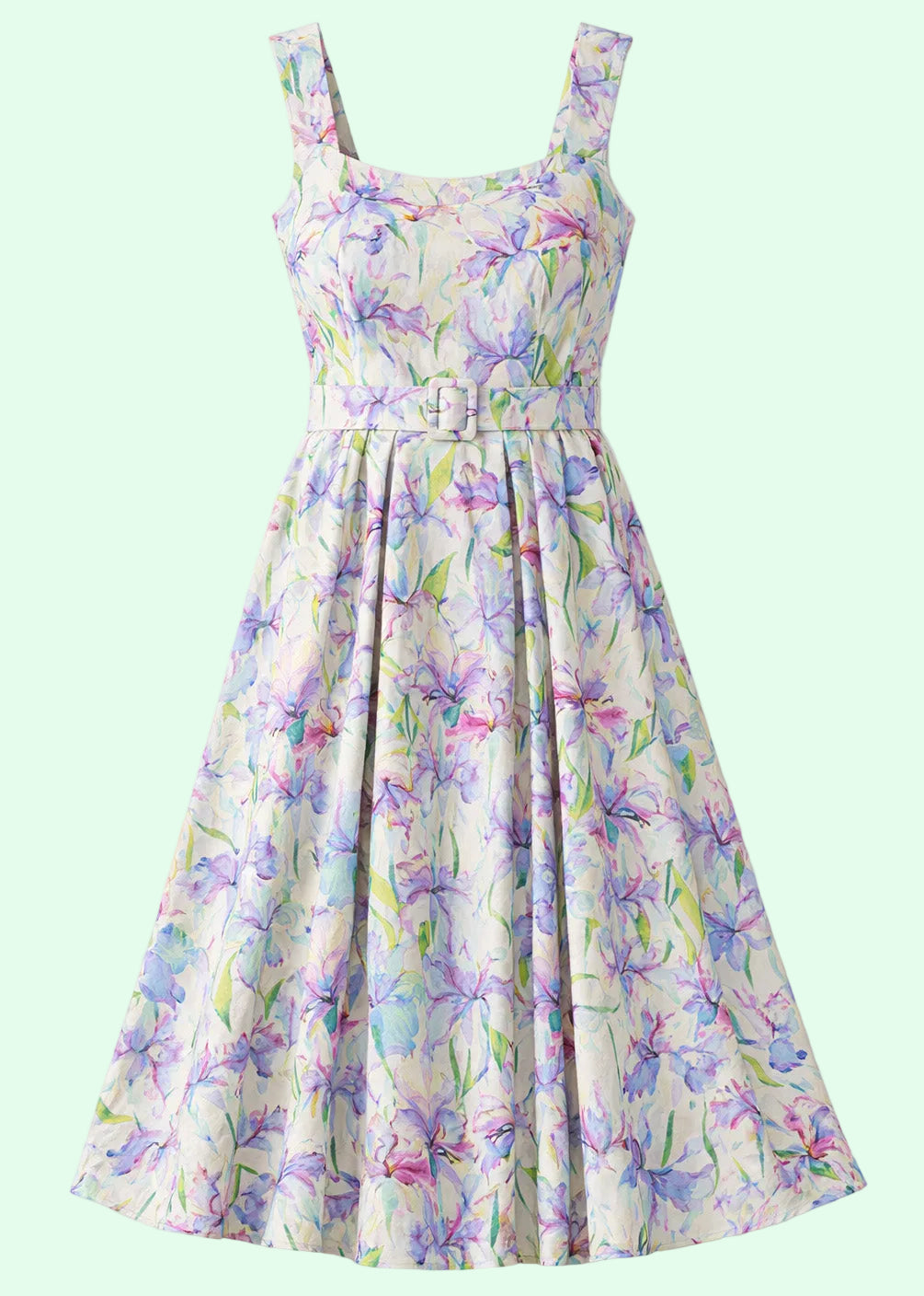Overdelen er designet med fine læg ved barmen og en elegant udskæring, som fremhæver din figur på en sofistikeret måde. Taljen markeres smukt med det medfølgende bælte, mens det vidde skørt falder flot og giver den ikoniske vintage swing-effekt, vi elsker. Ryggen er dækket (se modelbilleder for korrekt gengivelse).