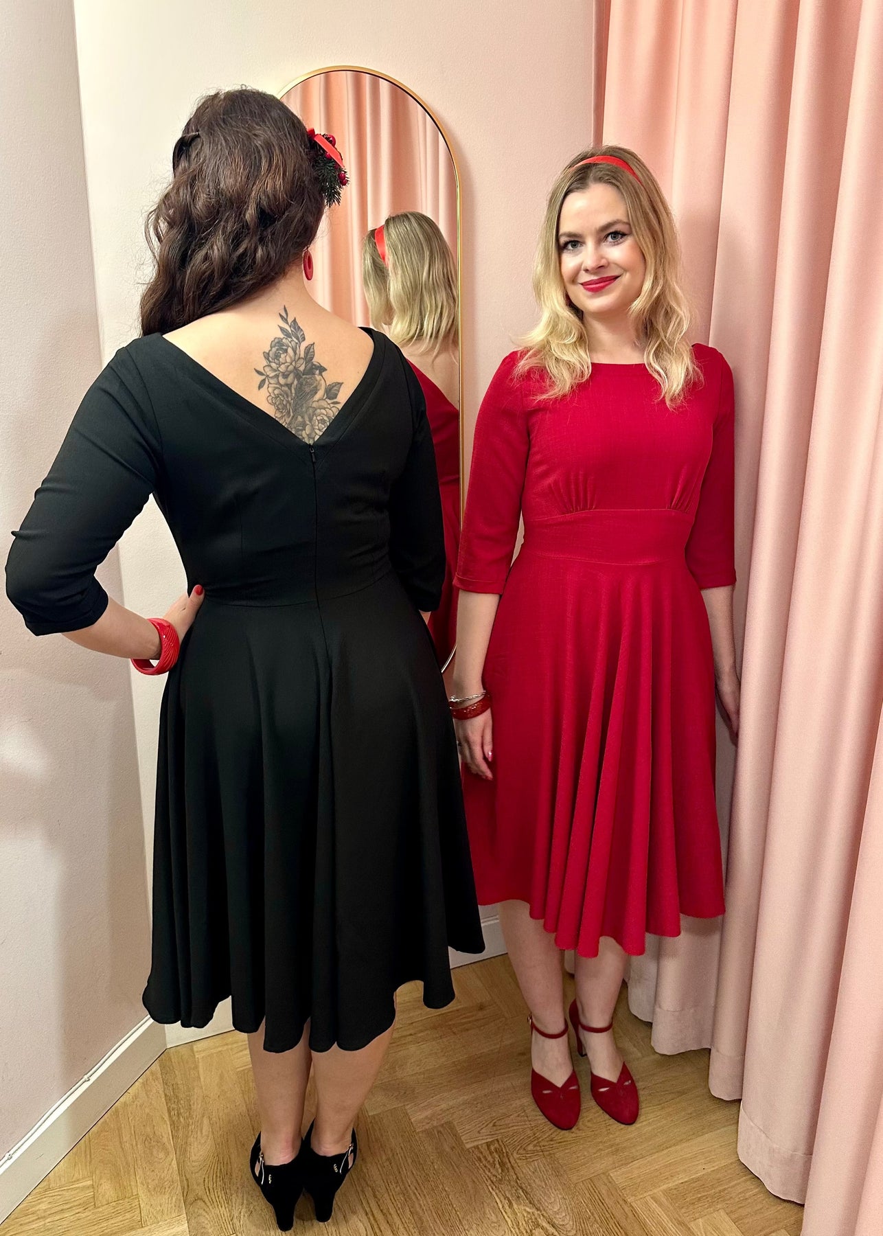 Simona er 163 cm høj og har kjolen på i str 36. Tanja (i den sorte kjole) er 169 cm høj og har kjolen på i str 40.