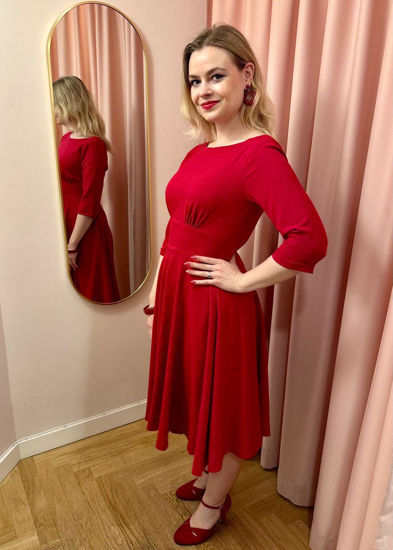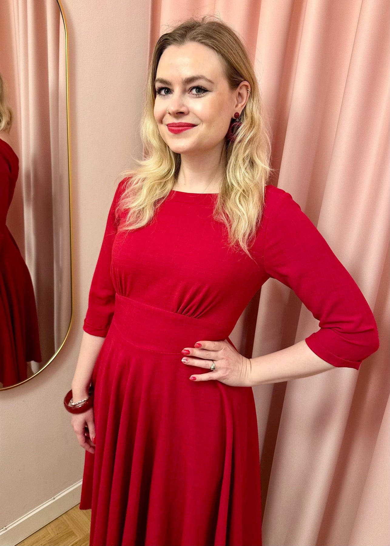 Kjolen har et bredt taljestykke, der fremhæver taljen og skaber den klassiske hourglass-form. Den let rynkede overdel og det fulde swingskørt gør kjolen ideel til dans, bevægelse og fest.