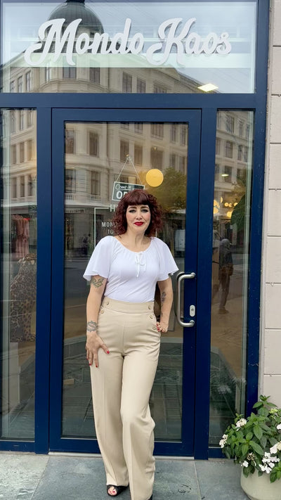 Højtaljede sailor bukser med knapper i siderne fra Daisy Dapper i beige sand.