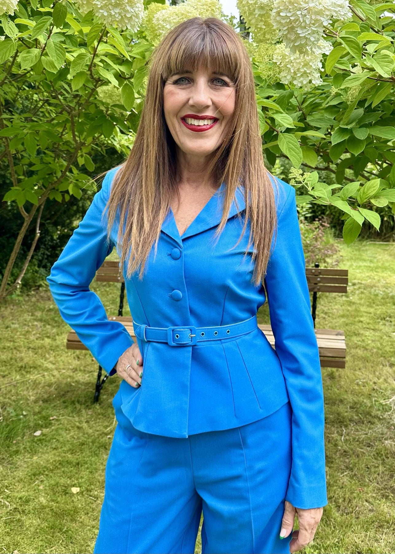 1940'er inspireret figursyet blazer i sommerblå fra Daisy Dapper med bælte.