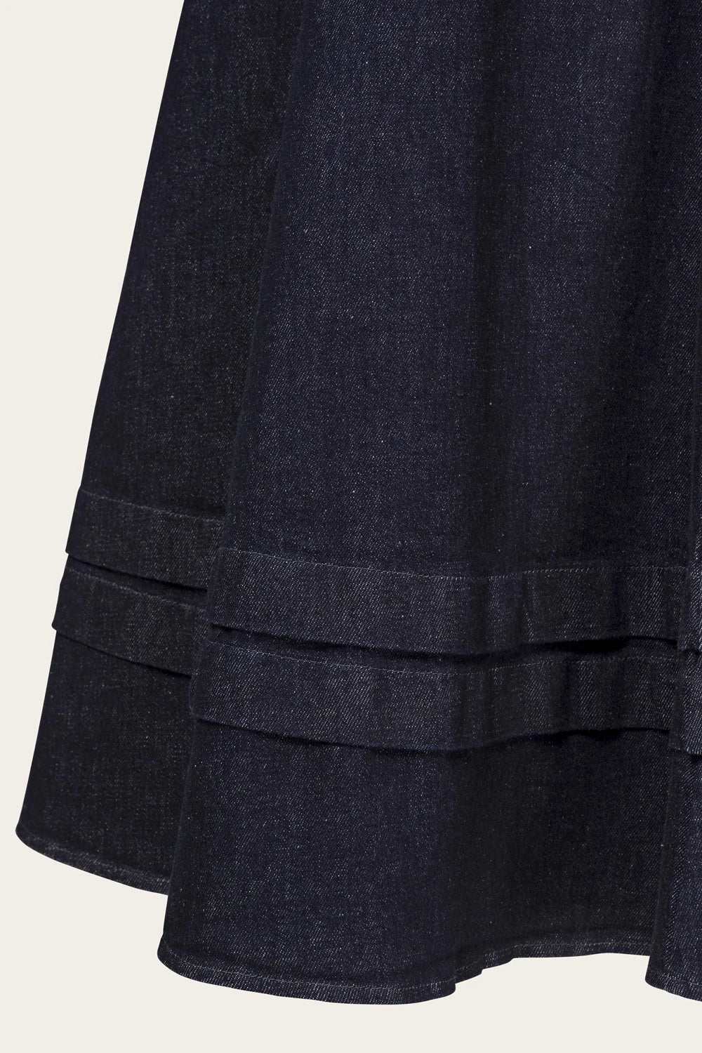 Som med alt denim kan du opleve, at den blå farve smitter en smule af på hænder og møbler. Vi har testet nederdelen, og den smitter ikke af på undertøj eller skjorter, der er stoppet ned i linningen. Ønsker du at bevare den dybe blå farve, bør du undgå at vaske den for ofte – og vil du hellere have et lysere denim-look, kan du bare vaske den så ofte, du vil.